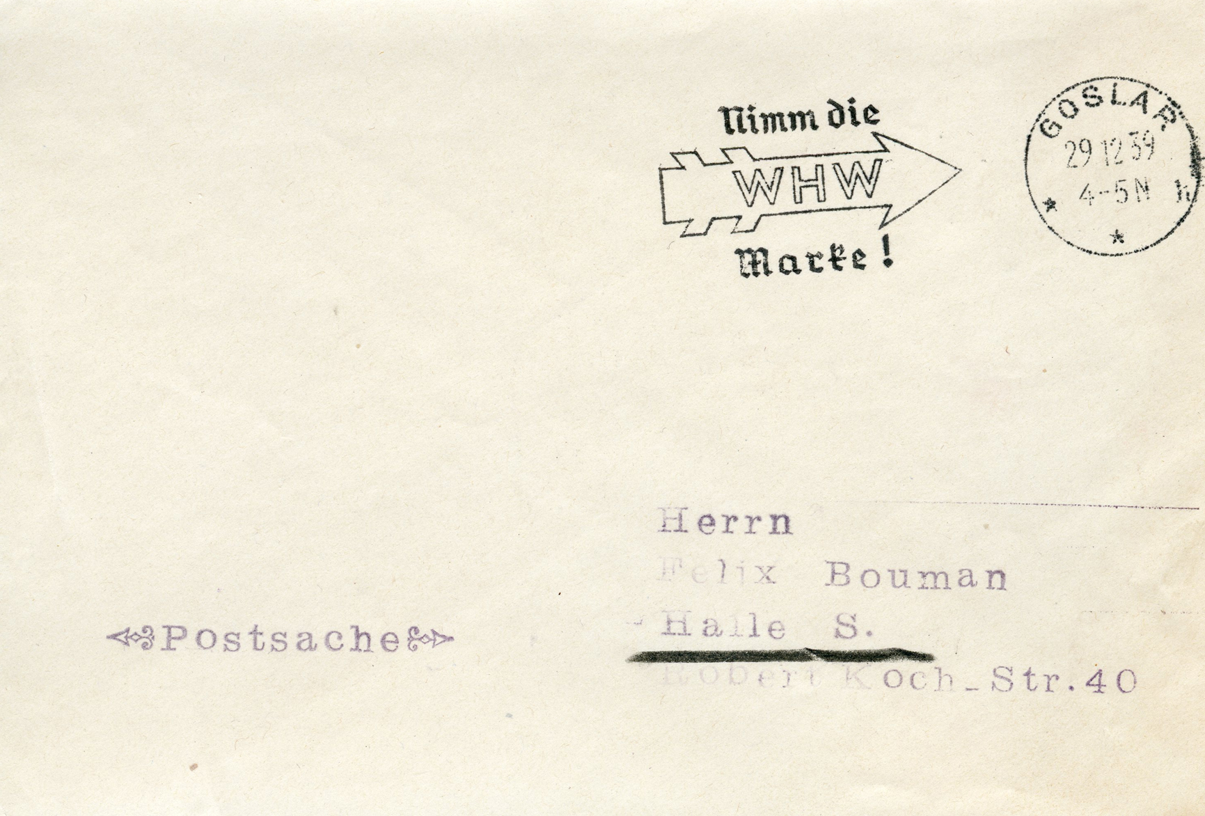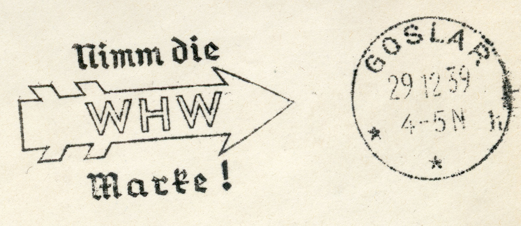 [Above: This is a strange one. I've never seen the cancel before. It says: 'Nimm die WHW Marke!' (Take the WHW brand!). Hmmm... maybe there is a better way to translate it. Goslar cancels from December 29, 1939. Click to enlarge.]
