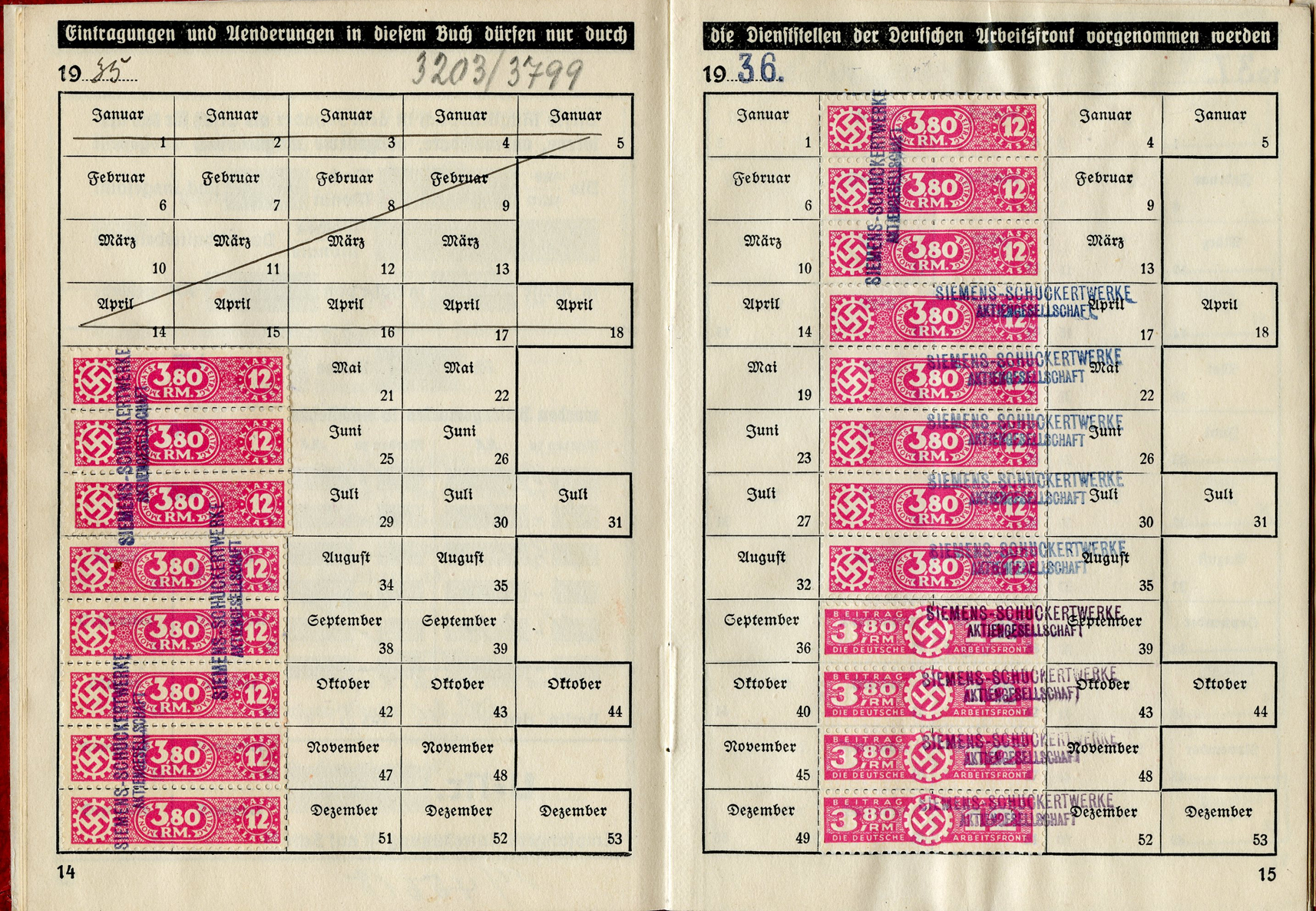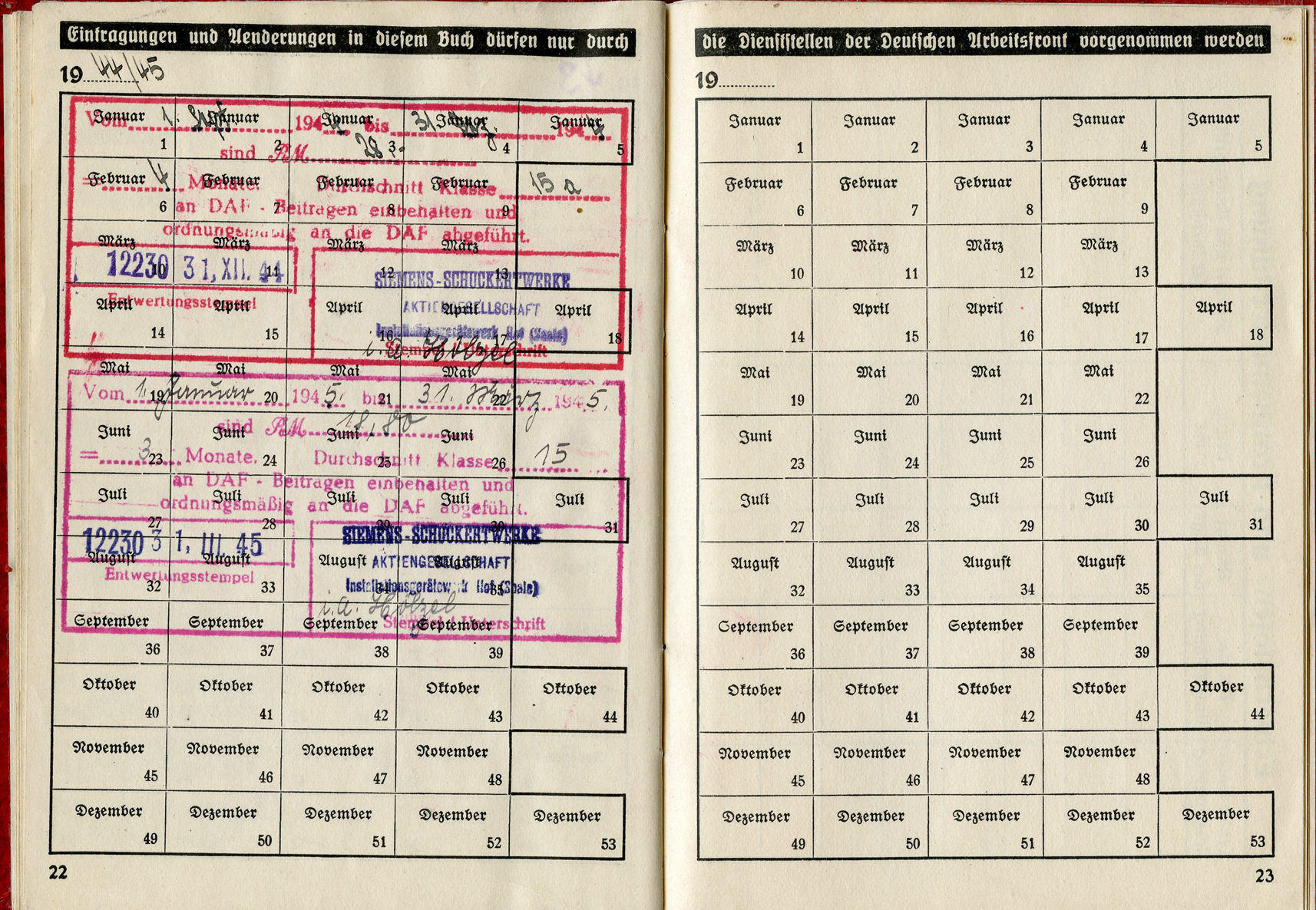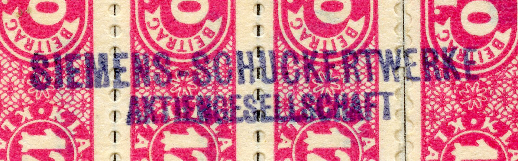 [Below: Here are some huge ink stamps, perhaps replacing the normal tax stamps, and they reveal our worker is with Siemens again. And he worked for Siemens until nearly the end of the war, March 31, 1945. Okay Siemens, I want my damn rail car.]
