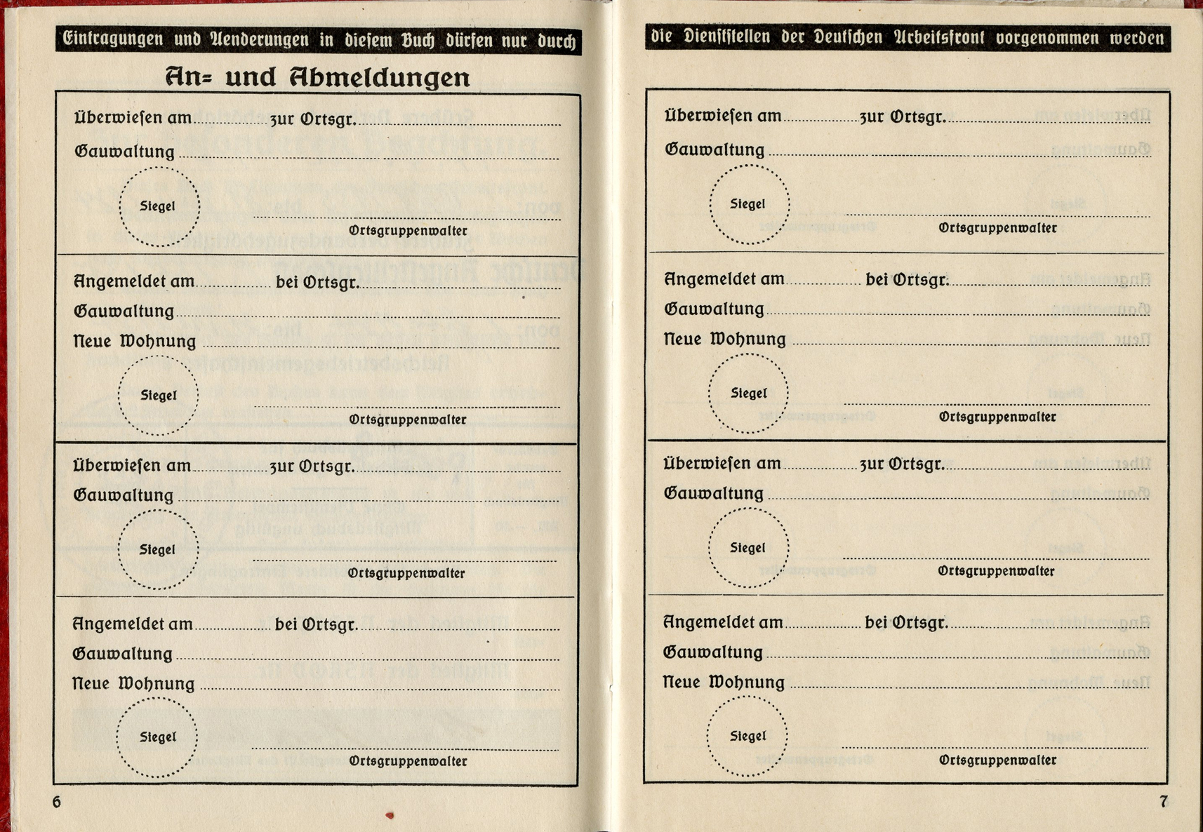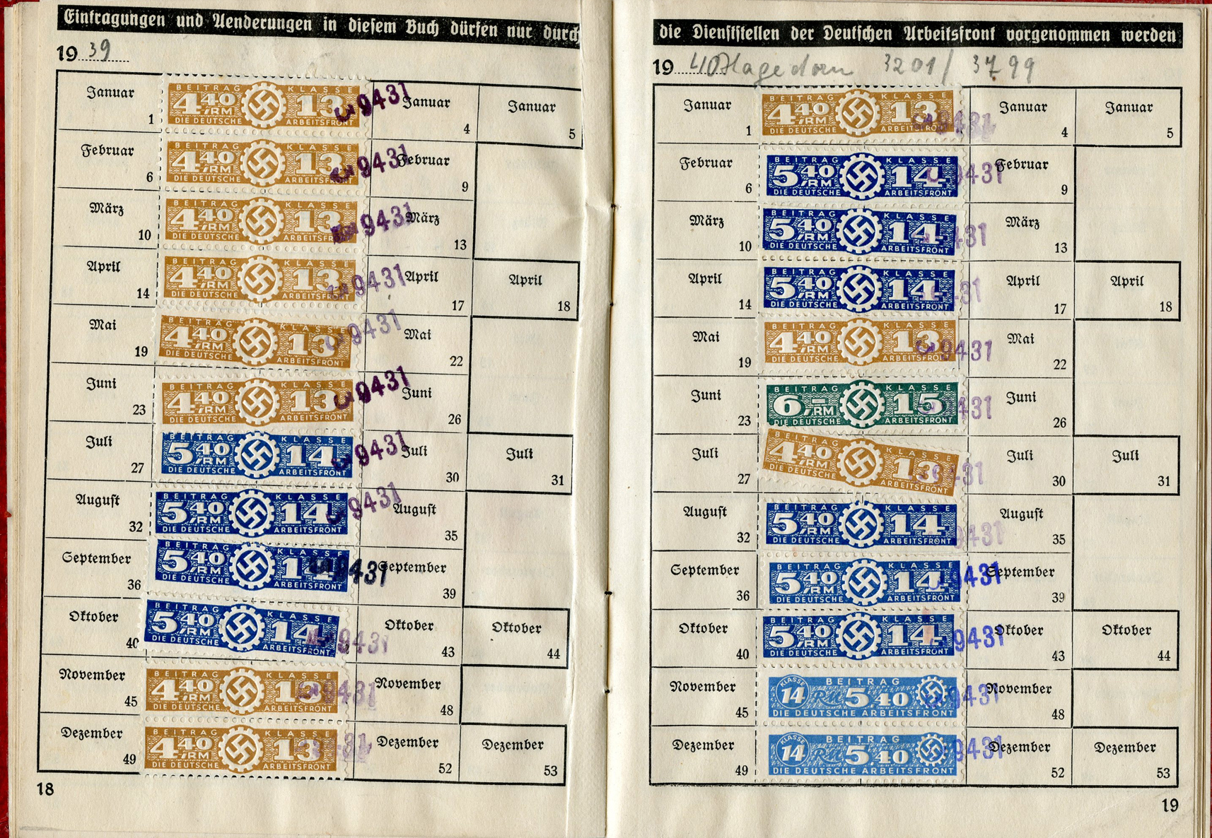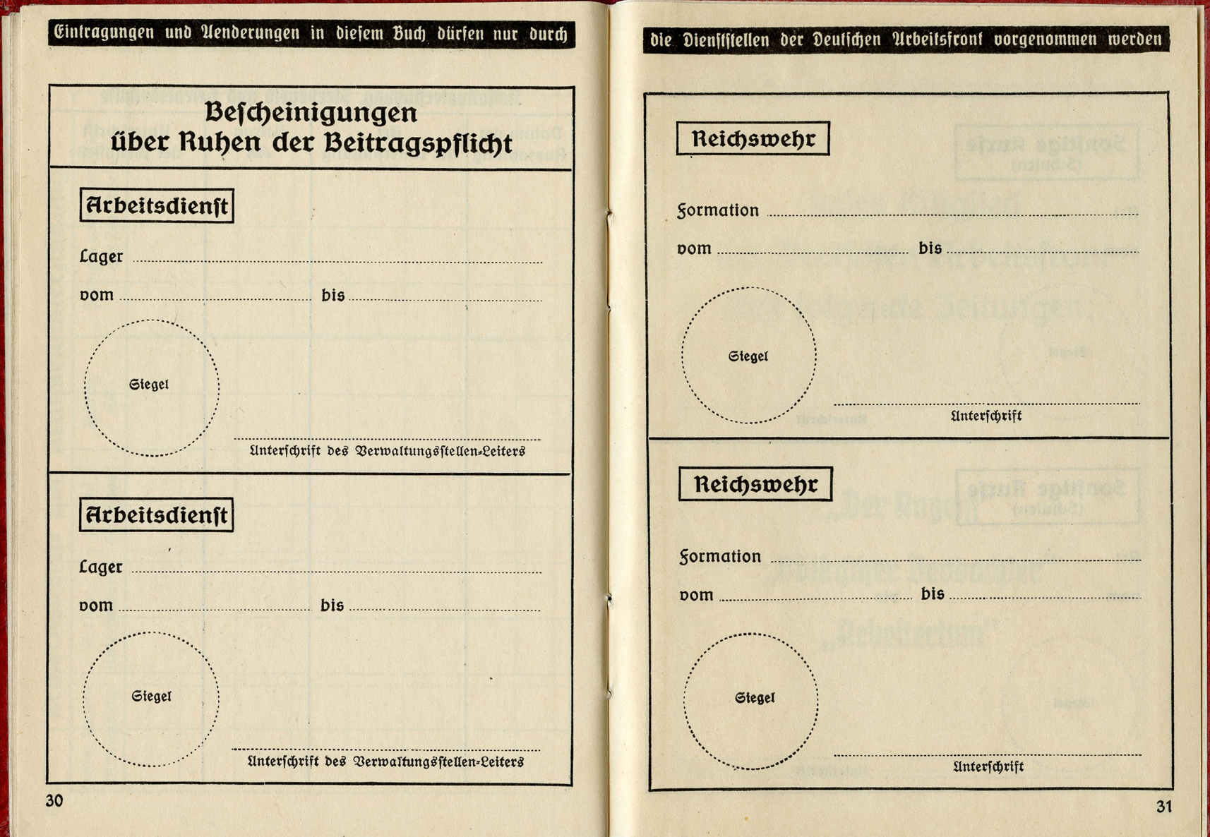 [Below: Here are some huge ink stamps, perhaps replacing the normal tax stamps, and they reveal our worker is with Siemens again. And he worked for Siemens until nearly the end of the war, March 31, 1945. Okay Siemens, I want my damn rail car.]
