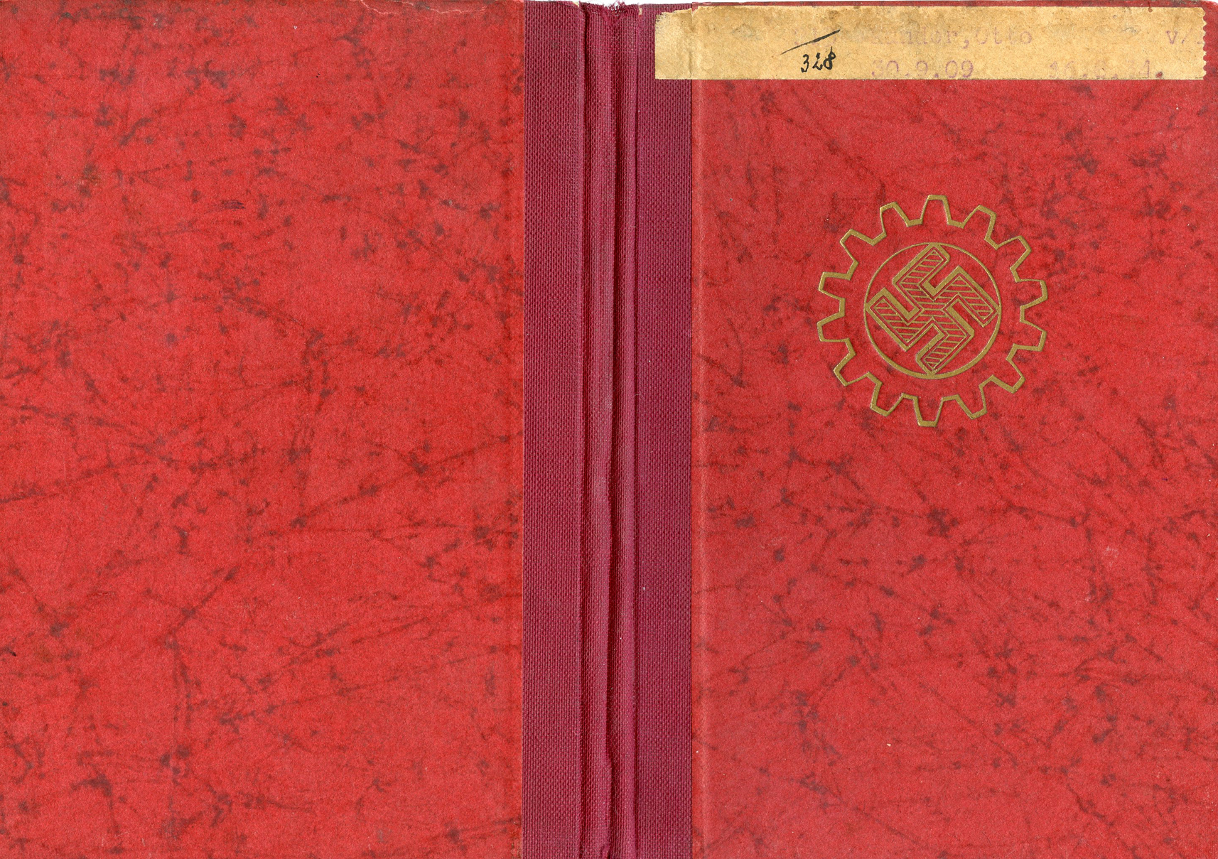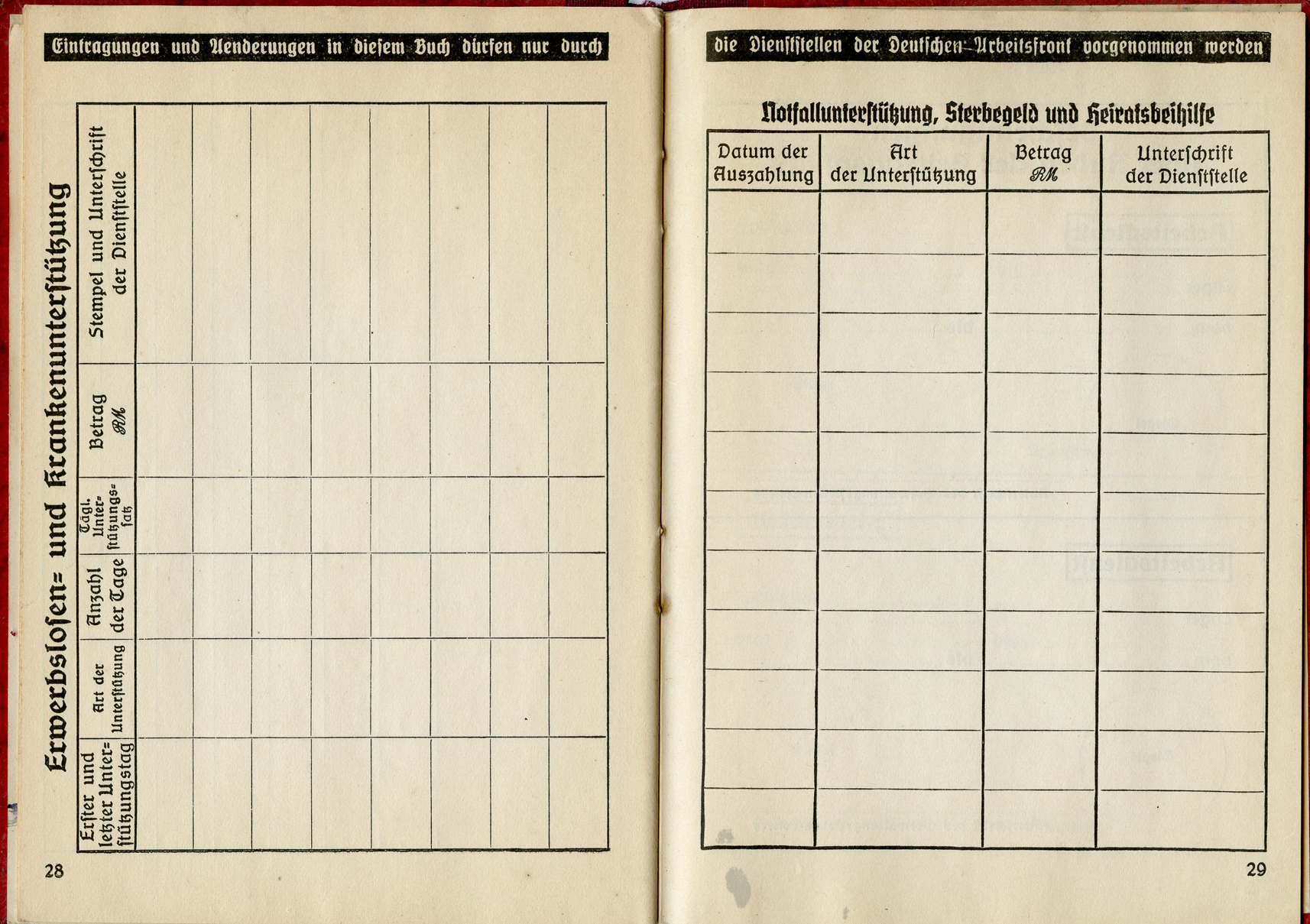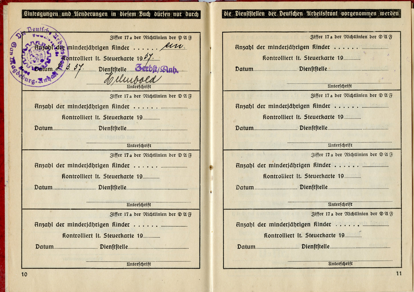 [Below: This has a 'merkblatt' (information sheet) glued into the beginning of the book. Usually these are just loose stuck inside the DAF books, but mostly missing altogether. The merkblatt is made of acidic, almost newspaper quality paper, and is seeping into the pages around it.]