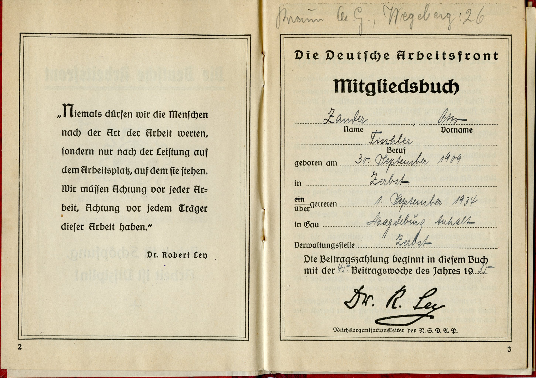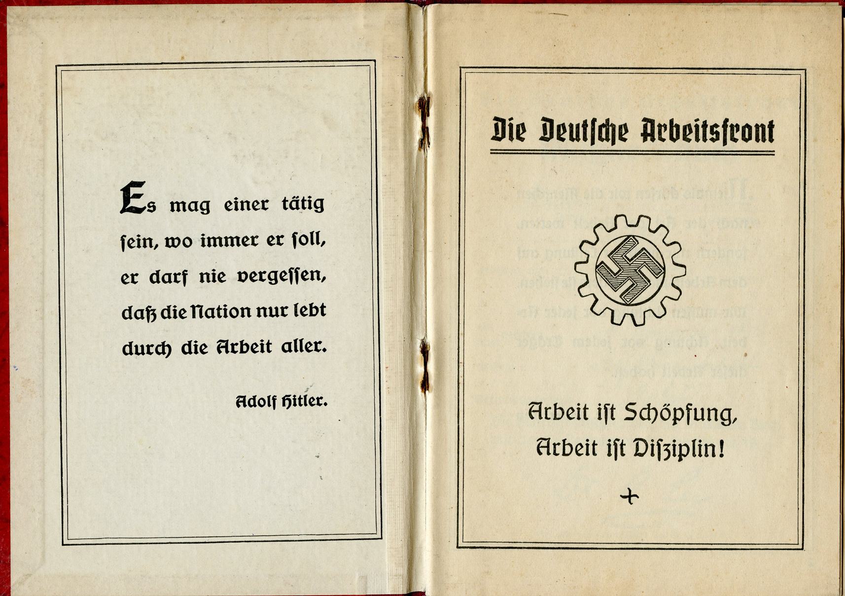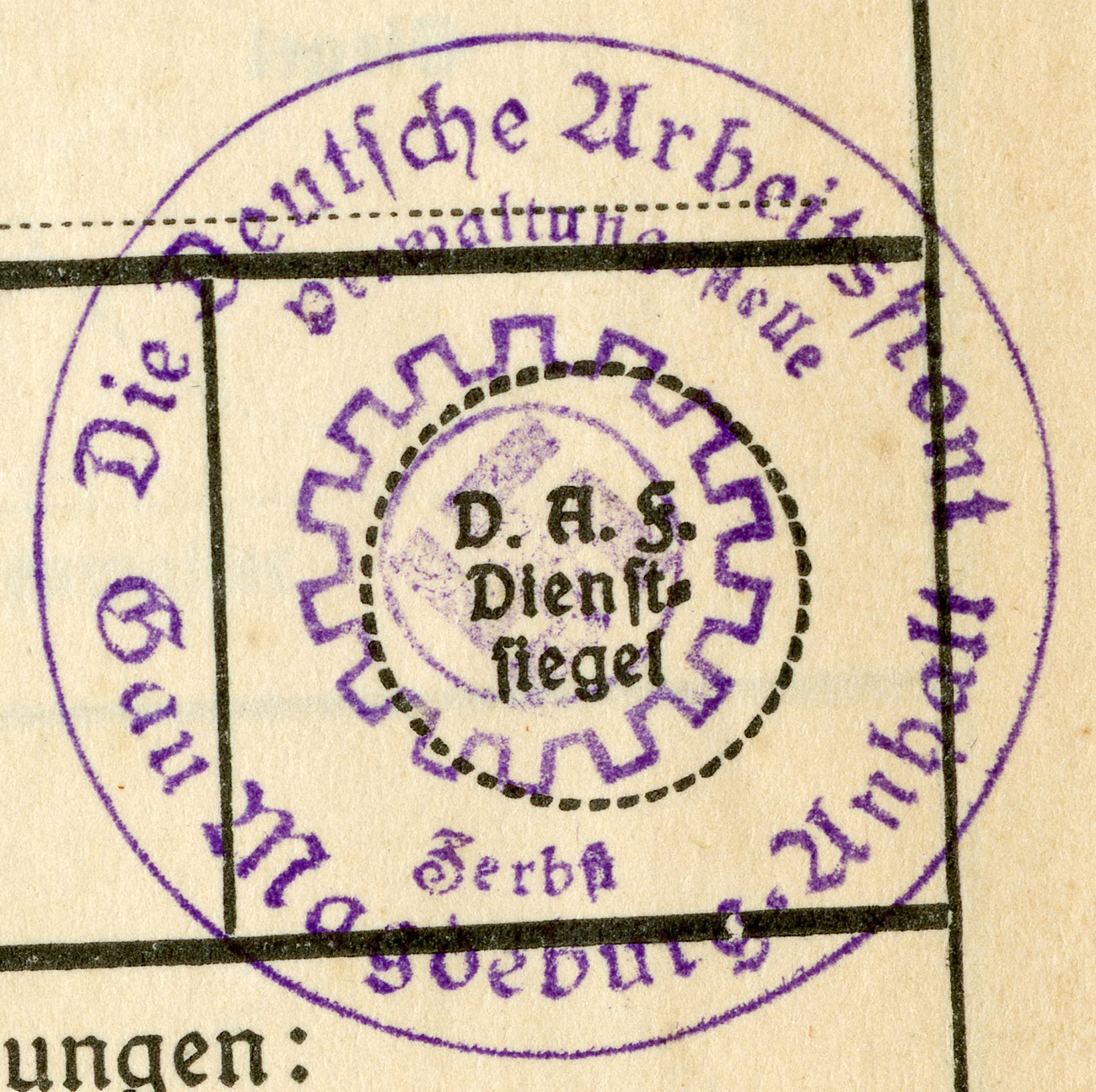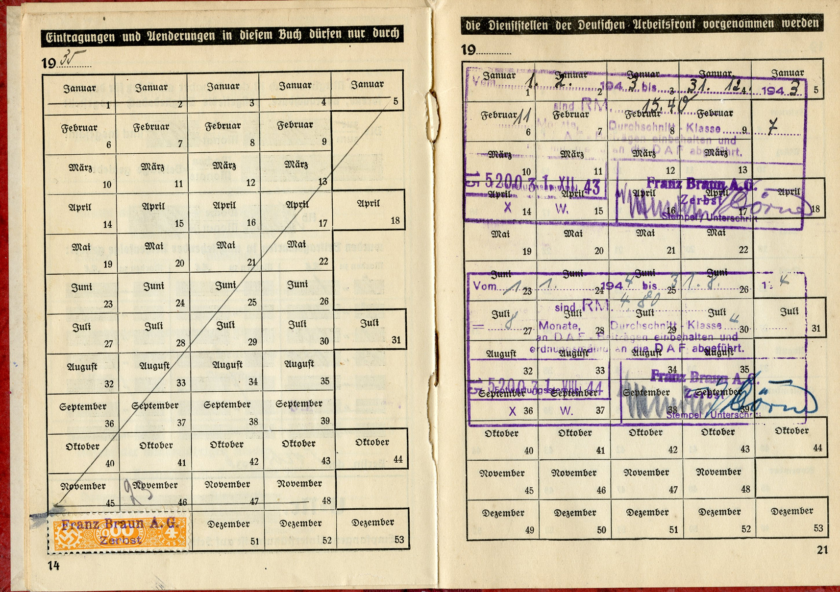 [Below: This has a 'merkblatt' (information sheet) glued into the beginning of the book. Usually these are just loose stuck inside the DAF books, but mostly missing altogether. The merkblatt is made of acidic, almost newspaper quality paper, and is seeping into the pages around it.]
