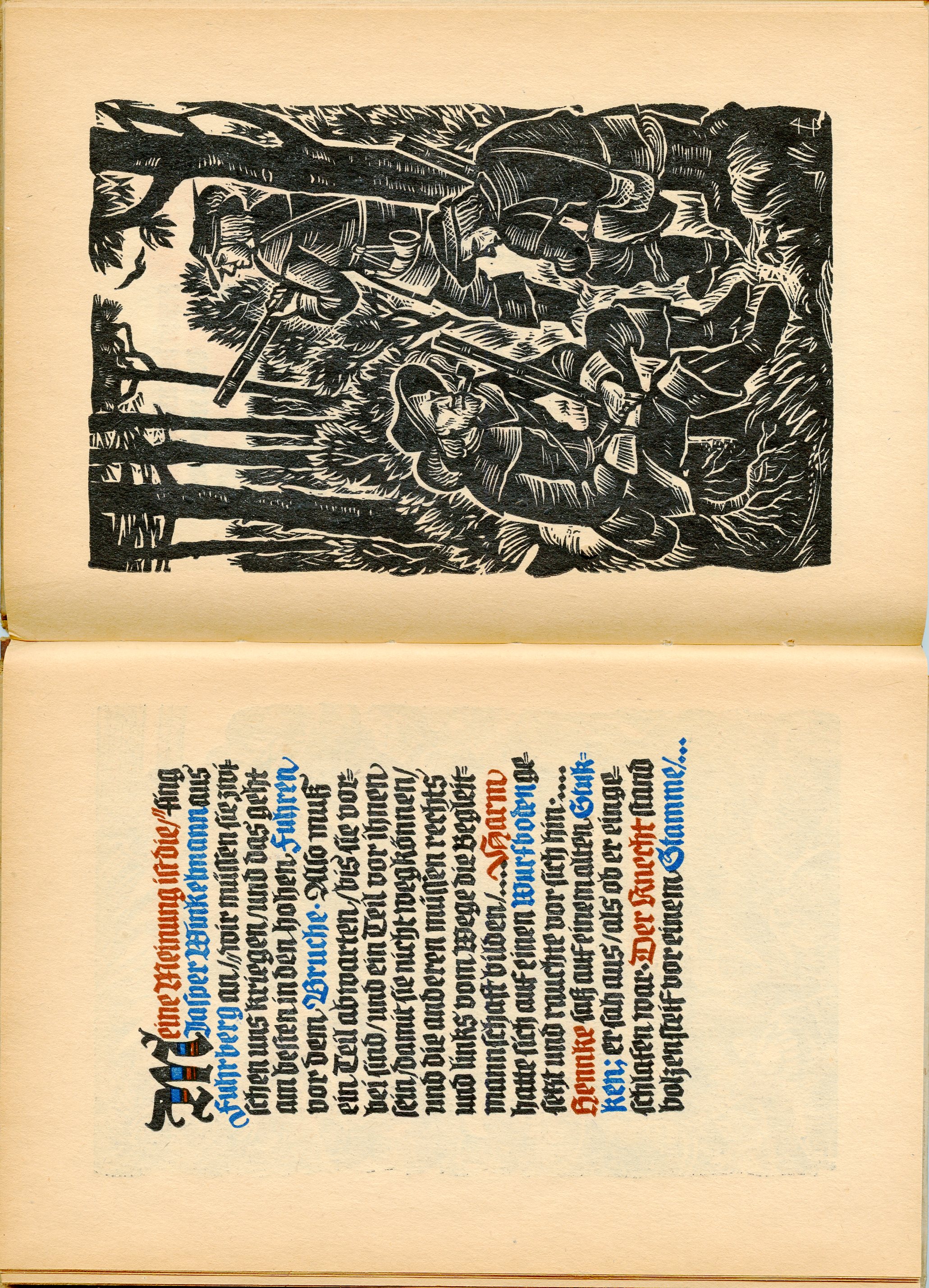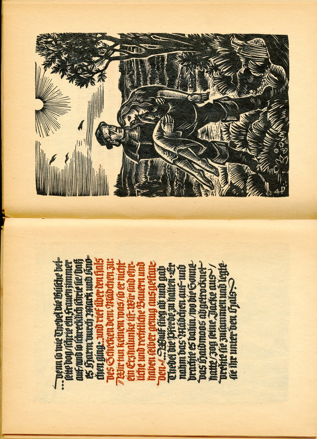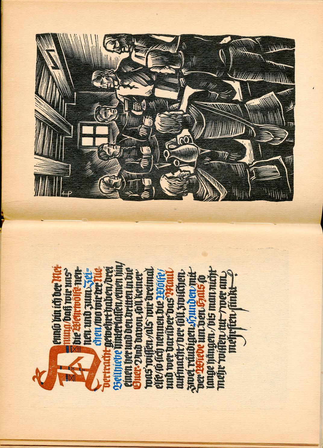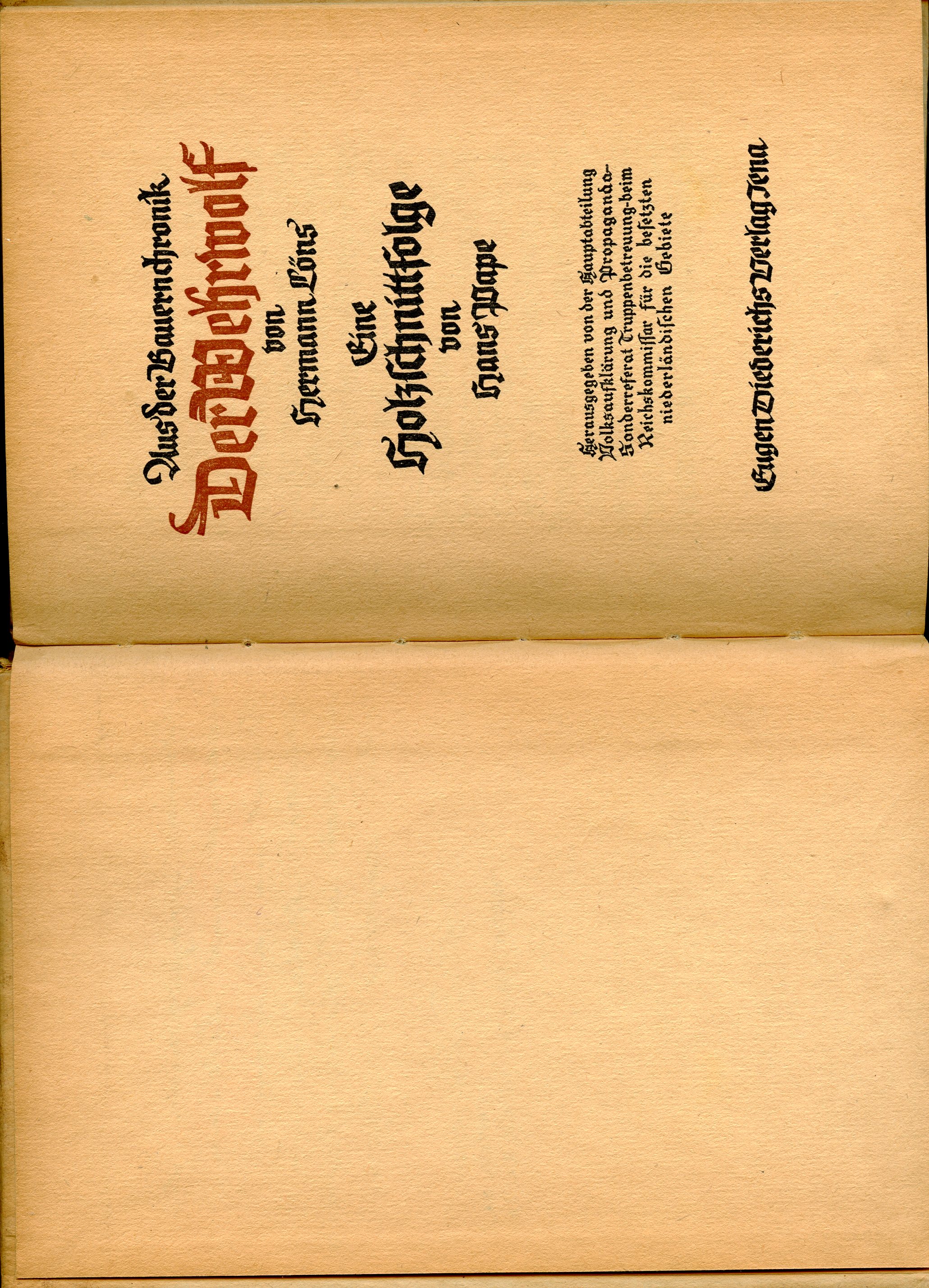 Here is the rare 1942 National Socialist edition of Der Wehrwolf, by Hermann Löns (1886-1971) 'Aus der Bauernchronik Der Wehrwolf von Hermann Löns - Eine Holzschnittfolge von Hans Pape' (From the peasant chronicle The Wehrwolf by Hermann Löns - A woodcut series by Hans Pape), 1942, Eugen Diederichs Verlag, Jena. Printed in Fraktur (German blackletter typeface or font), 44 pages, 5 x 7 inches. This edition features seventeen woodcuts by the superb German artist Hans Pape. Below you will find the PDF and very large JPG images in case the reader needs to use any of the images.