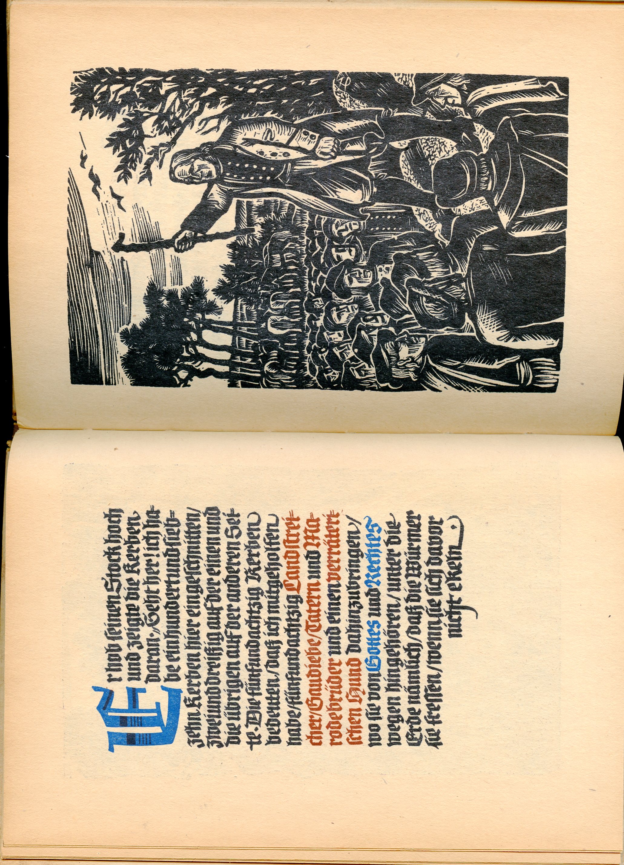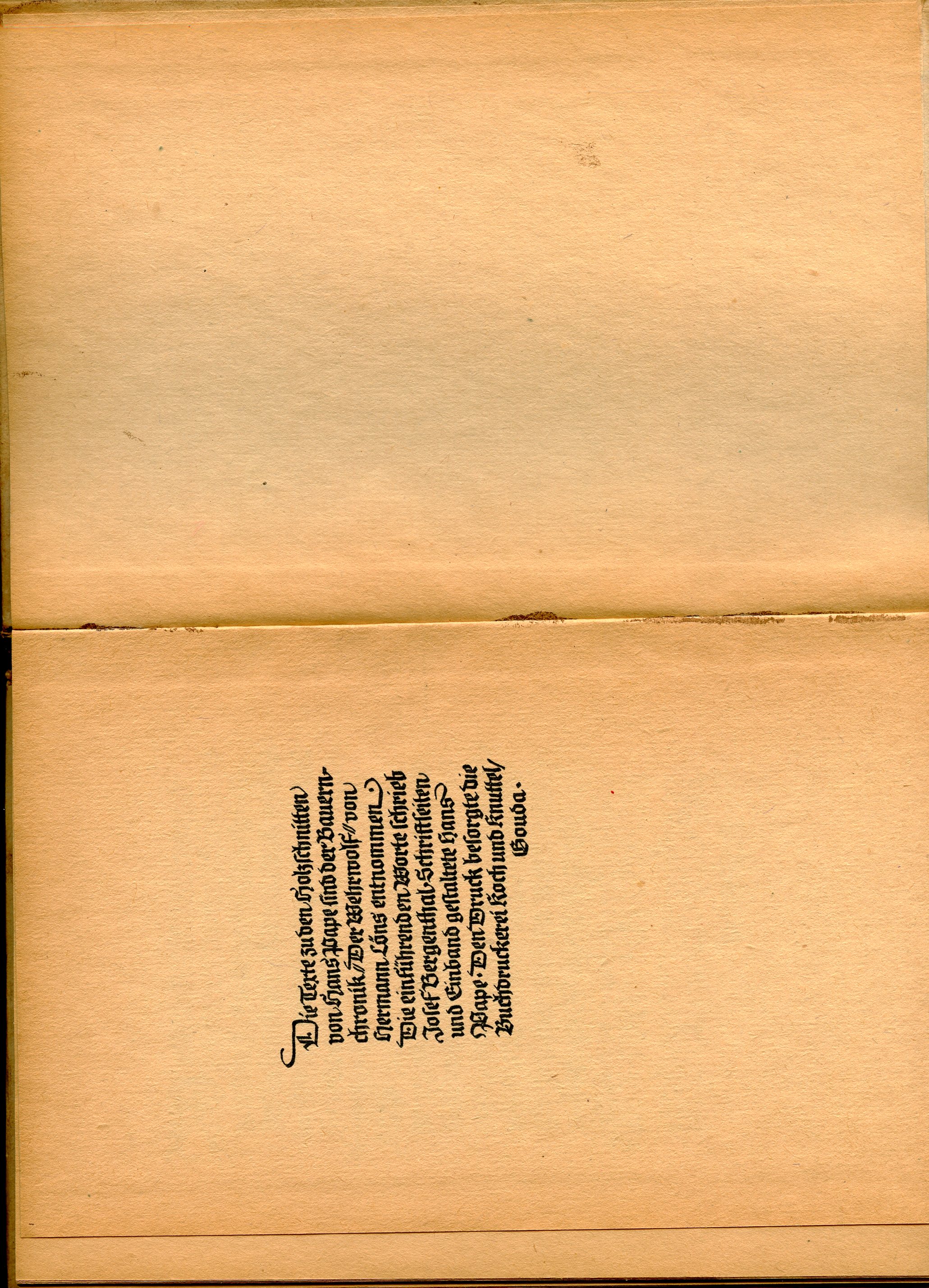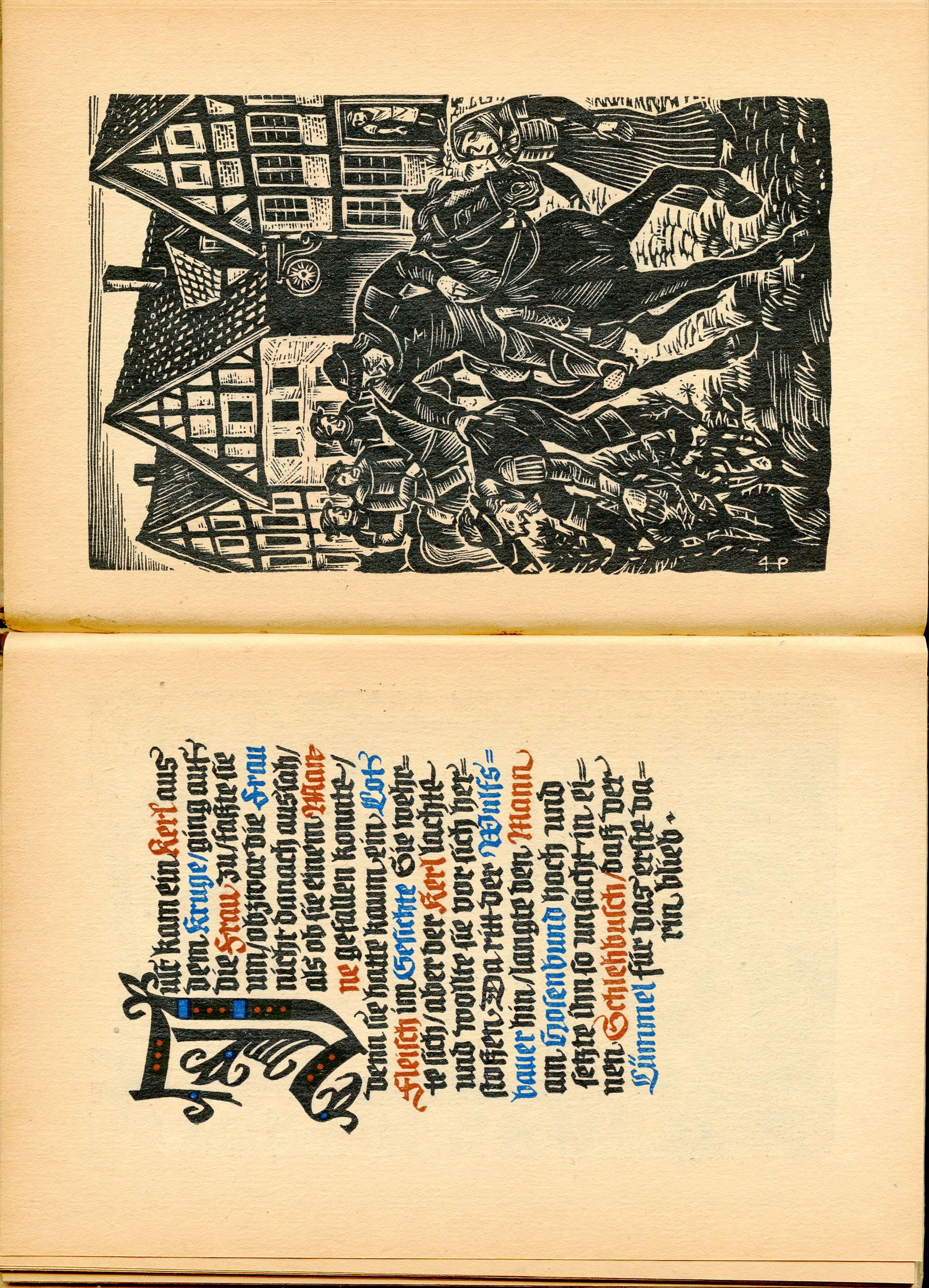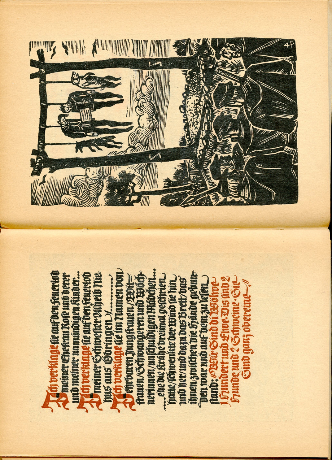 Here is the rare 1942 National Socialist edition of Der Wehrwolf, by Hermann Löns (1886-1971) 'Aus der Bauernchronik Der Wehrwolf von Hermann Löns - Eine Holzschnittfolge von Hans Pape' (From the peasant chronicle The Wehrwolf by Hermann Löns - A woodcut series by Hans Pape), 1942, Eugen Diederichs Verlag, Jena. Printed in Fraktur (German blackletter typeface or font), 44 pages, 5 x 7 inches. This edition features seventeen woodcuts by the superb German artist Hans Pape. Below you will find the PDF and very large JPG images in case the reader needs to use any of the images.