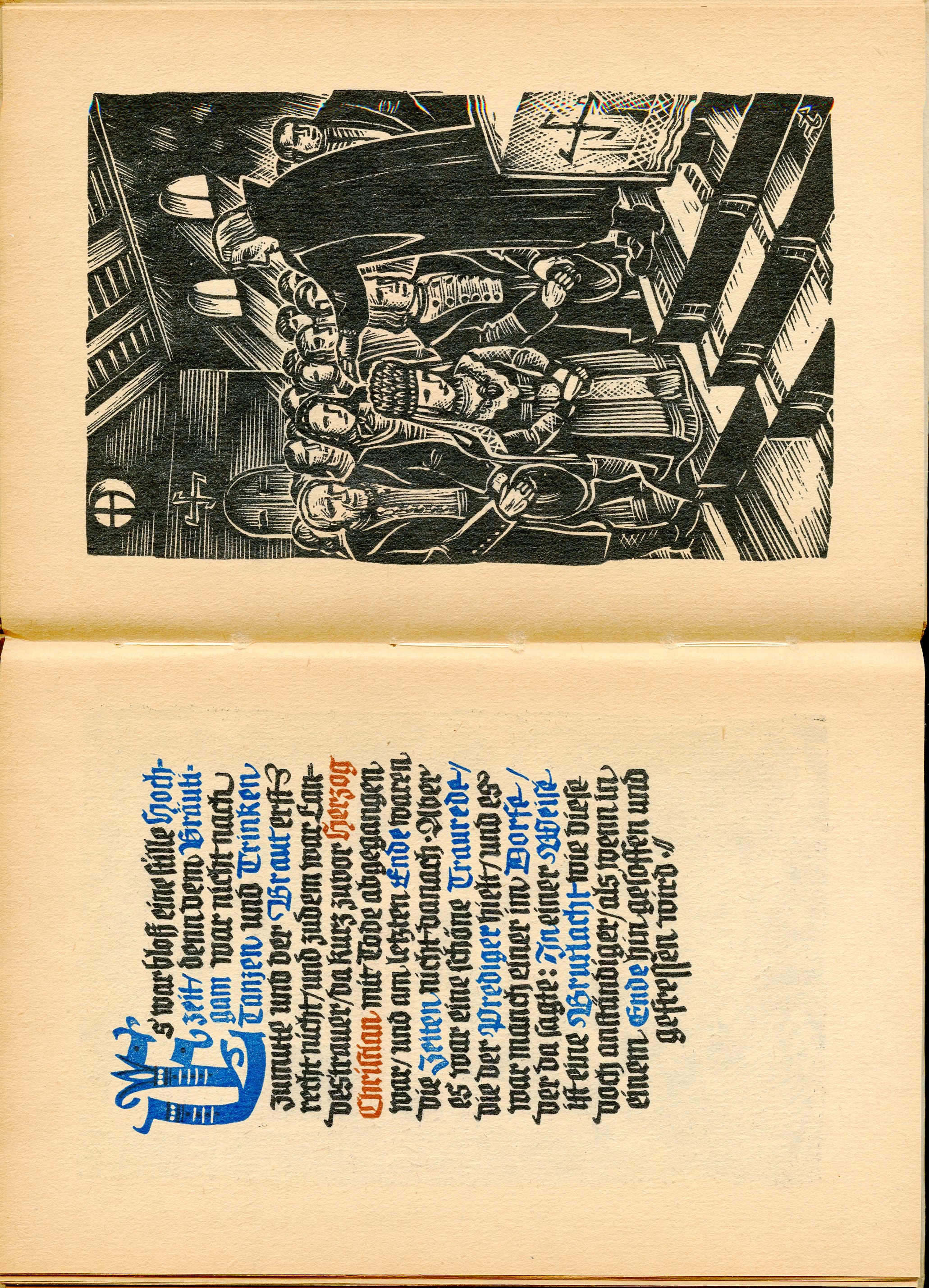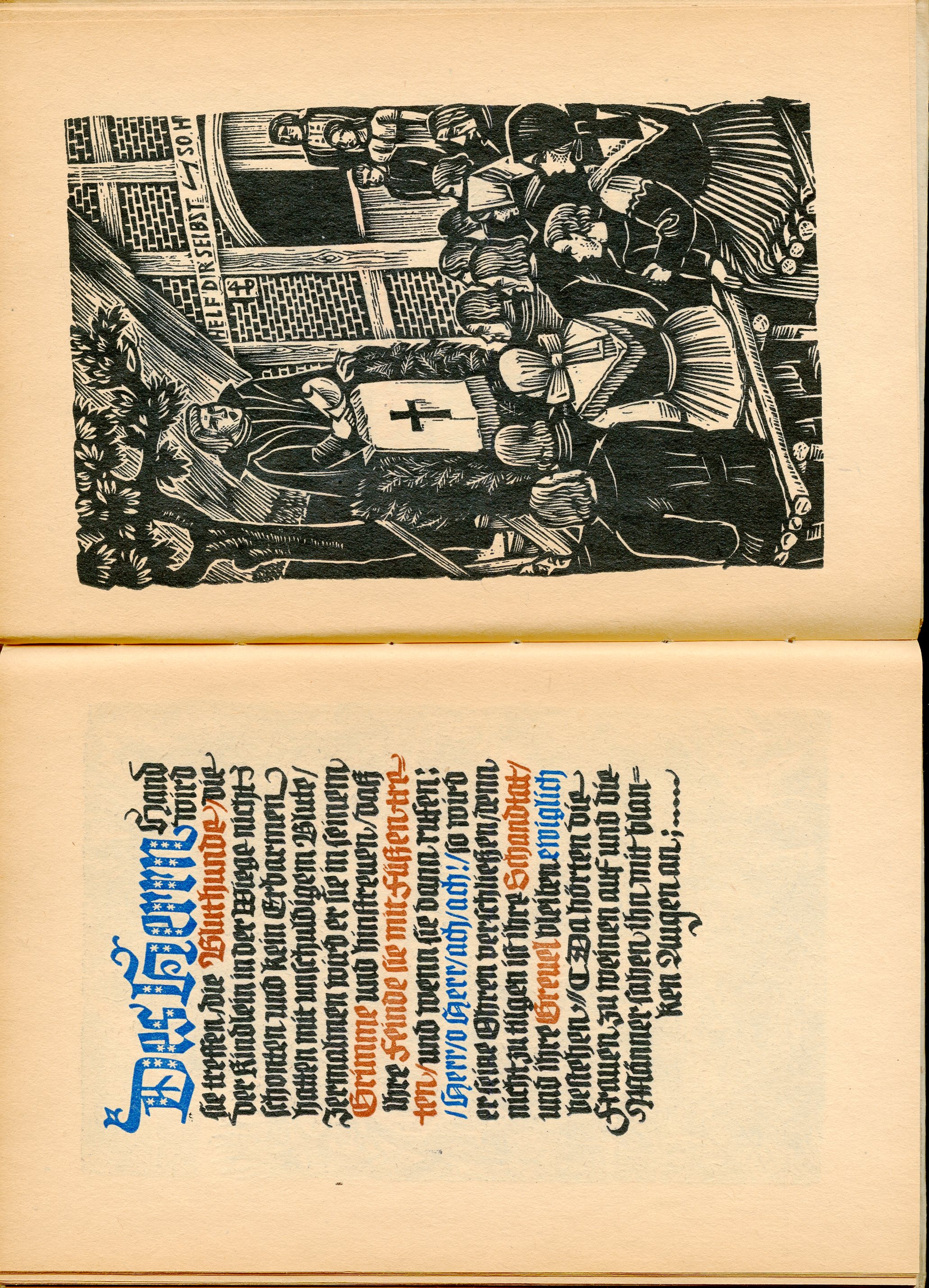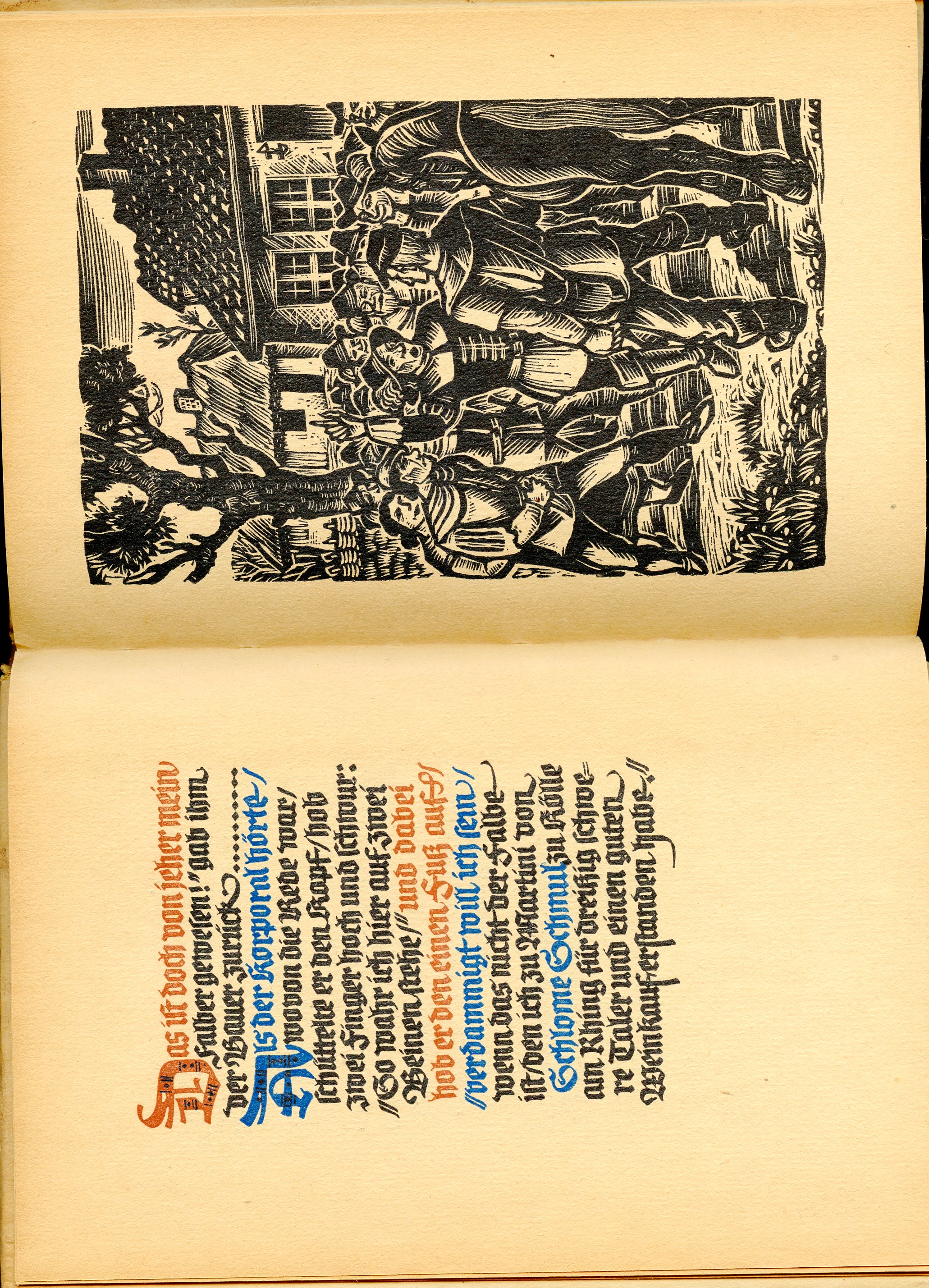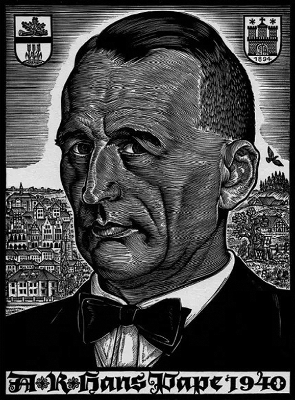 Here is the rare 1942 National Socialist edition of Der Wehrwolf, by Hermann Löns (1886-1971) 'Aus der Bauernchronik Der Wehrwolf von Hermann Löns - Eine Holzschnittfolge von Hans Pape' (From the peasant chronicle The Wehrwolf by Hermann Löns - A woodcut series by Hans Pape), 1942, Eugen Diederichs Verlag, Jena. Printed in Fraktur (German blackletter typeface or font), 44 pages, 5 x 7 inches. This edition features seventeen woodcuts by the superb German artist Hans Pape. Below you will find the PDF and very large JPG images in case the reader needs to use any of the images.