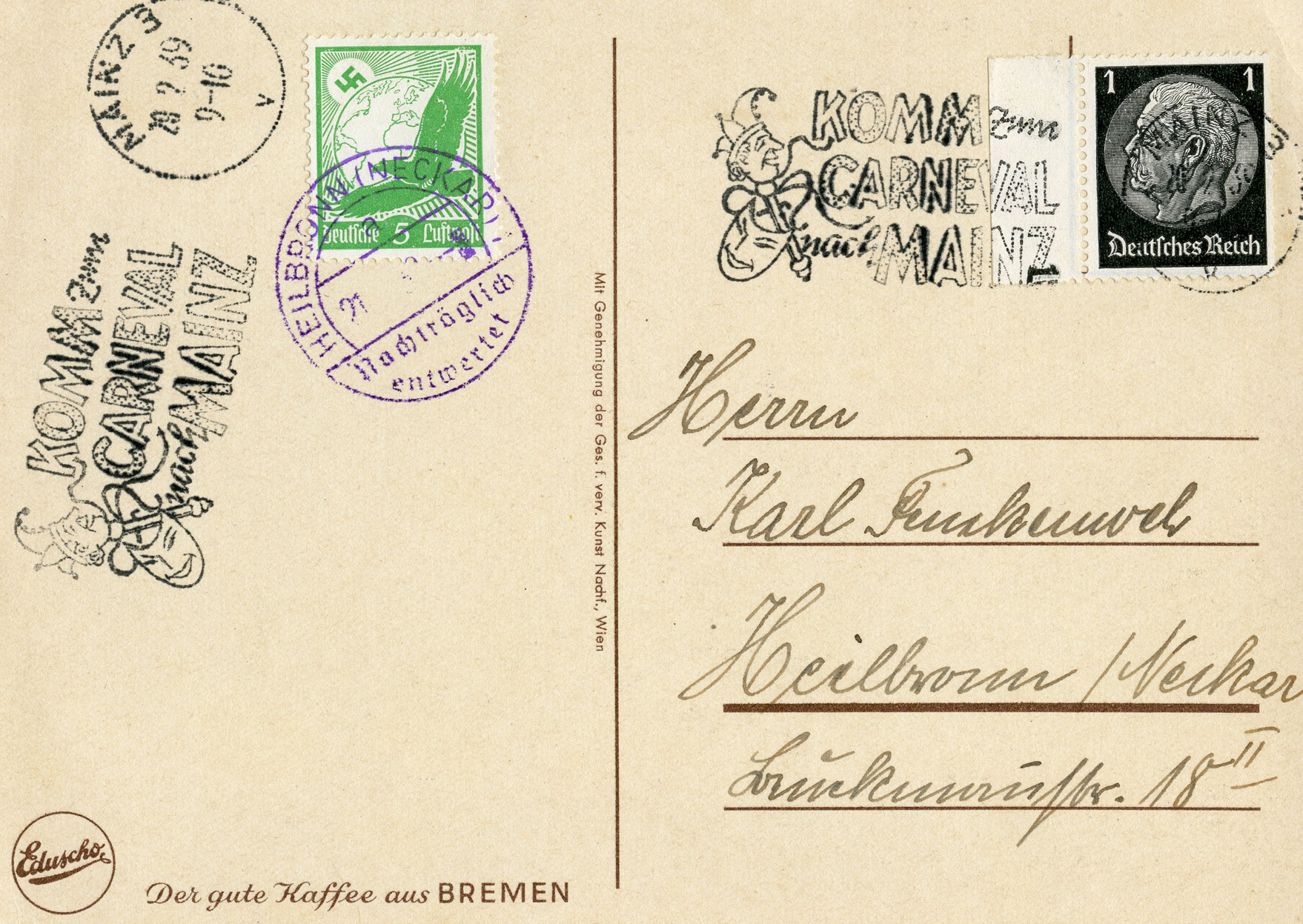 [Below: Postcard canceled in Mainz on February 29, 1939 (leap year) and sent to Heilbronn (Neckar), which has a blue cancel on an airmail stamp which says 'Nachträglich entwertet' (Canceled afterwards). The fancy cancel from Mainz says: 'Komm zum Carneval nach Mainz' (Come to the Carnival in Mainz). The carnival cancel is on an unrelated coffee postcard.]