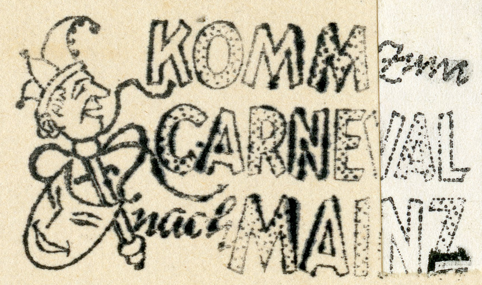 [Below: Carnival postcard, it says: 'Ne Schöne Groß vum Kölsche Fastelovend (Kölner Karneval)' (A big beautiful picture from the Cologne Carnival (Cologne Carnival)). This postcard was sold in two colors (seen below). This carnival is still running today in Cologne.]