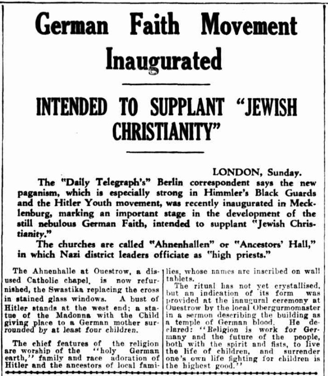 [Below: January 11, 1938 Daily Telegraph newspaper article regarding the German Faith Movement. ]