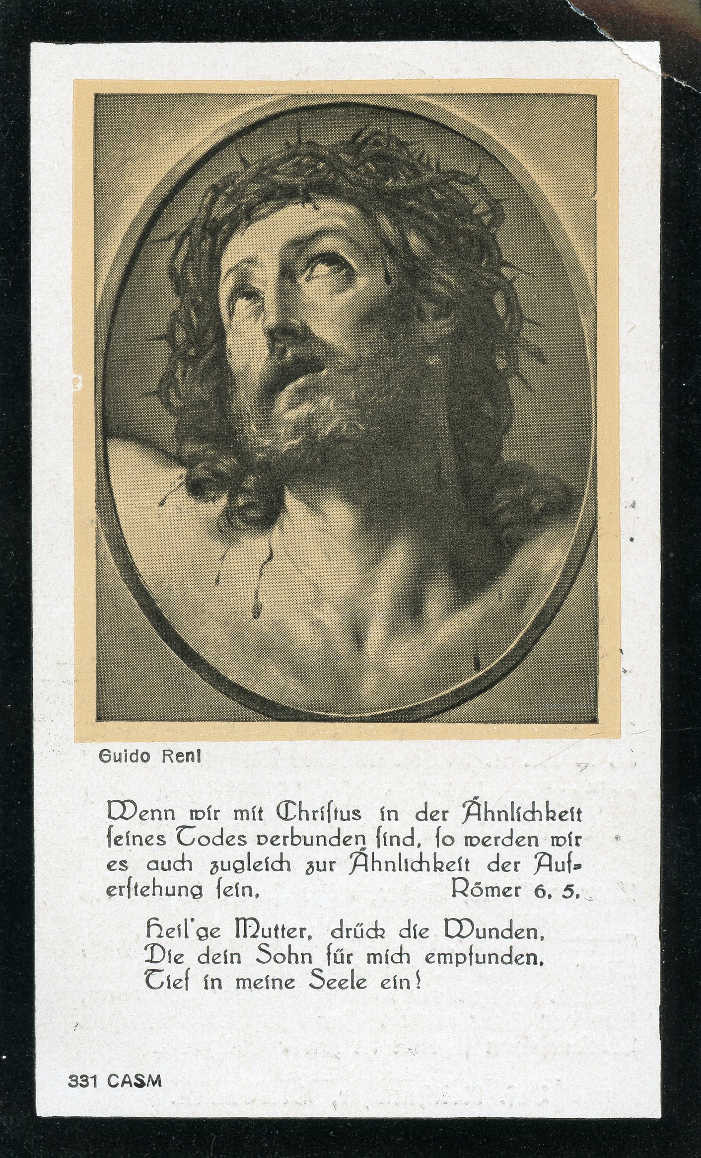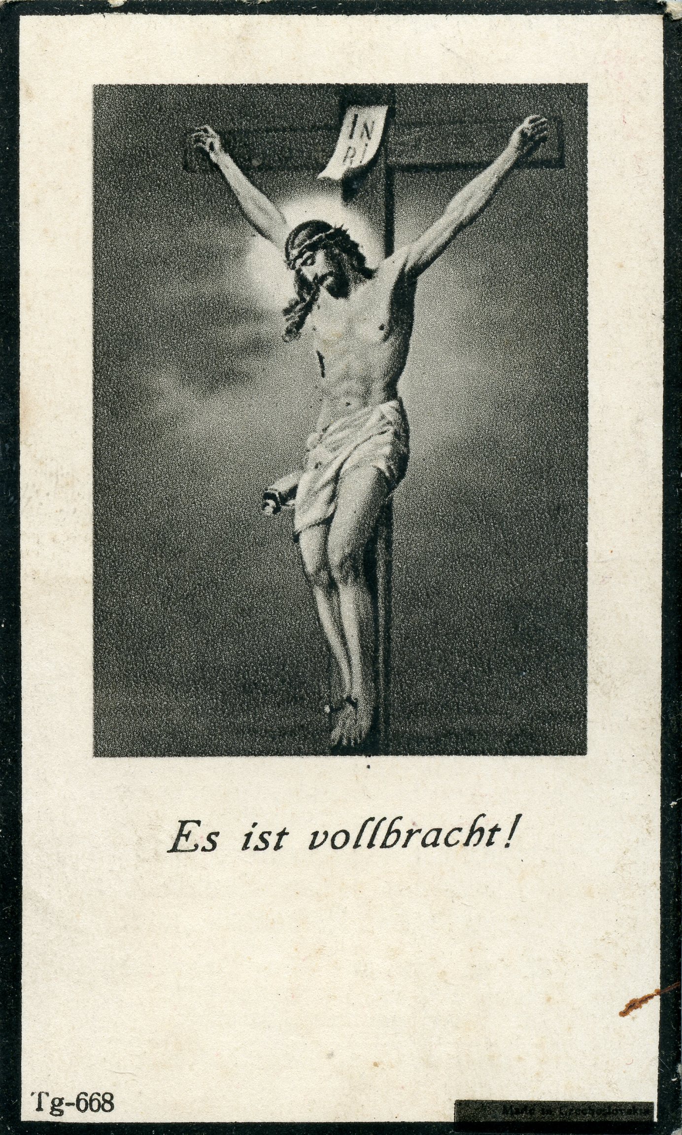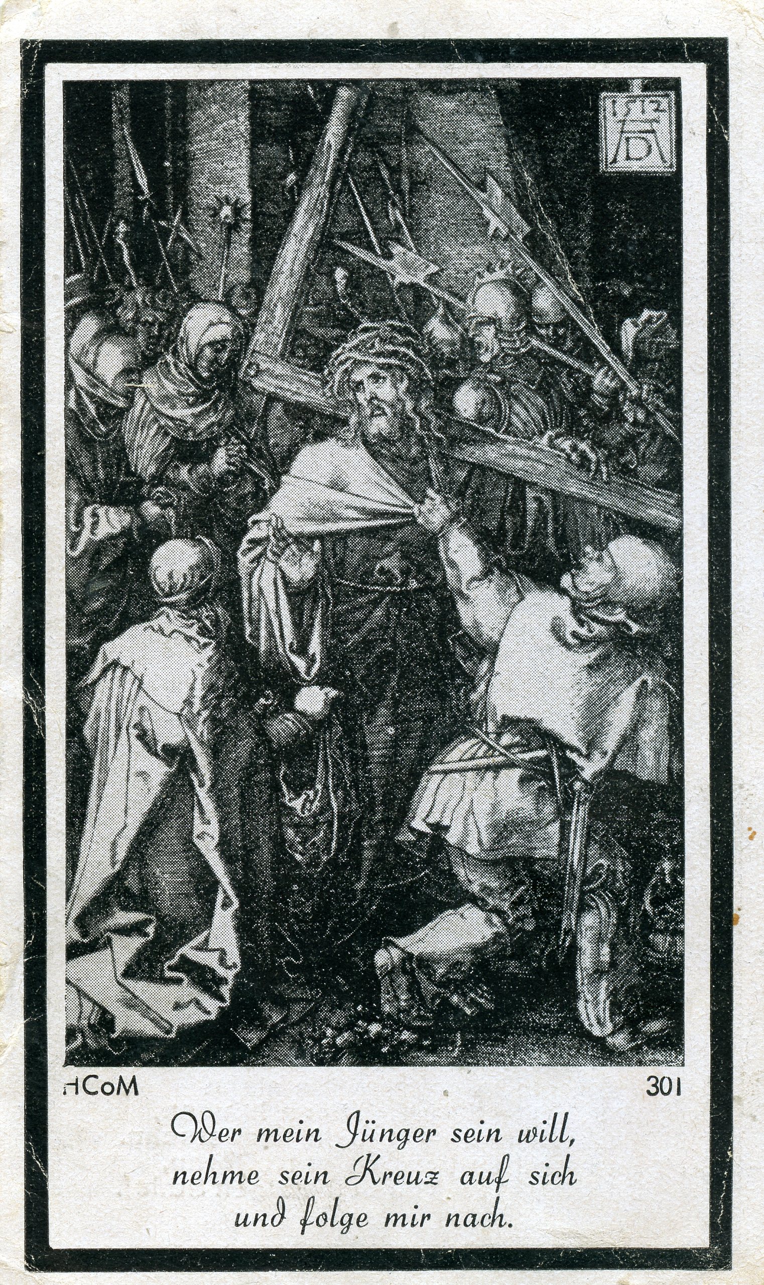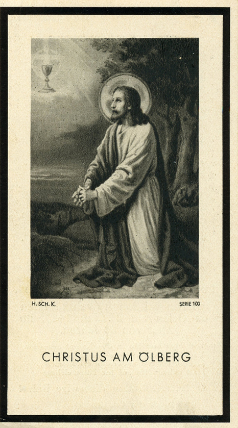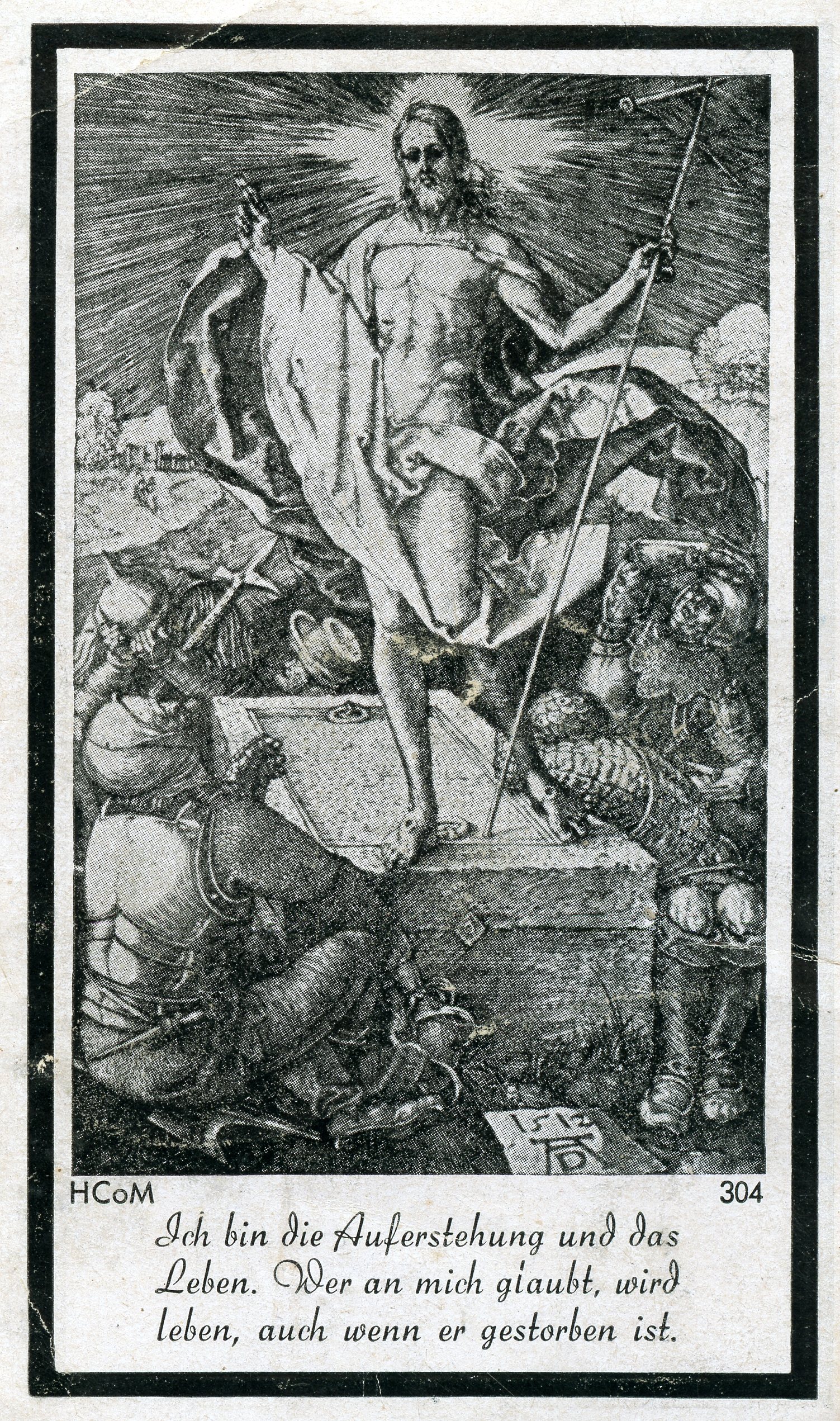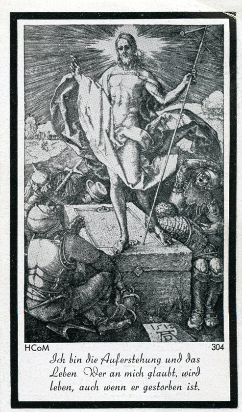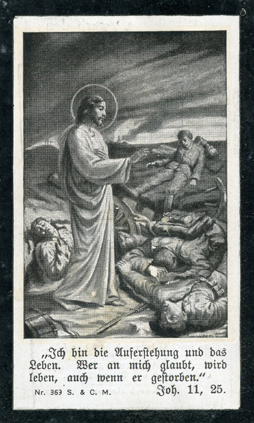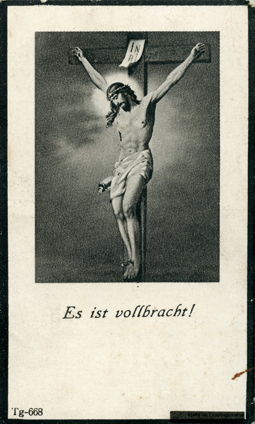 [Above: Another mourning card, this says: 'Er Starb, damit wir leben sollen' (He died so that we might live).]