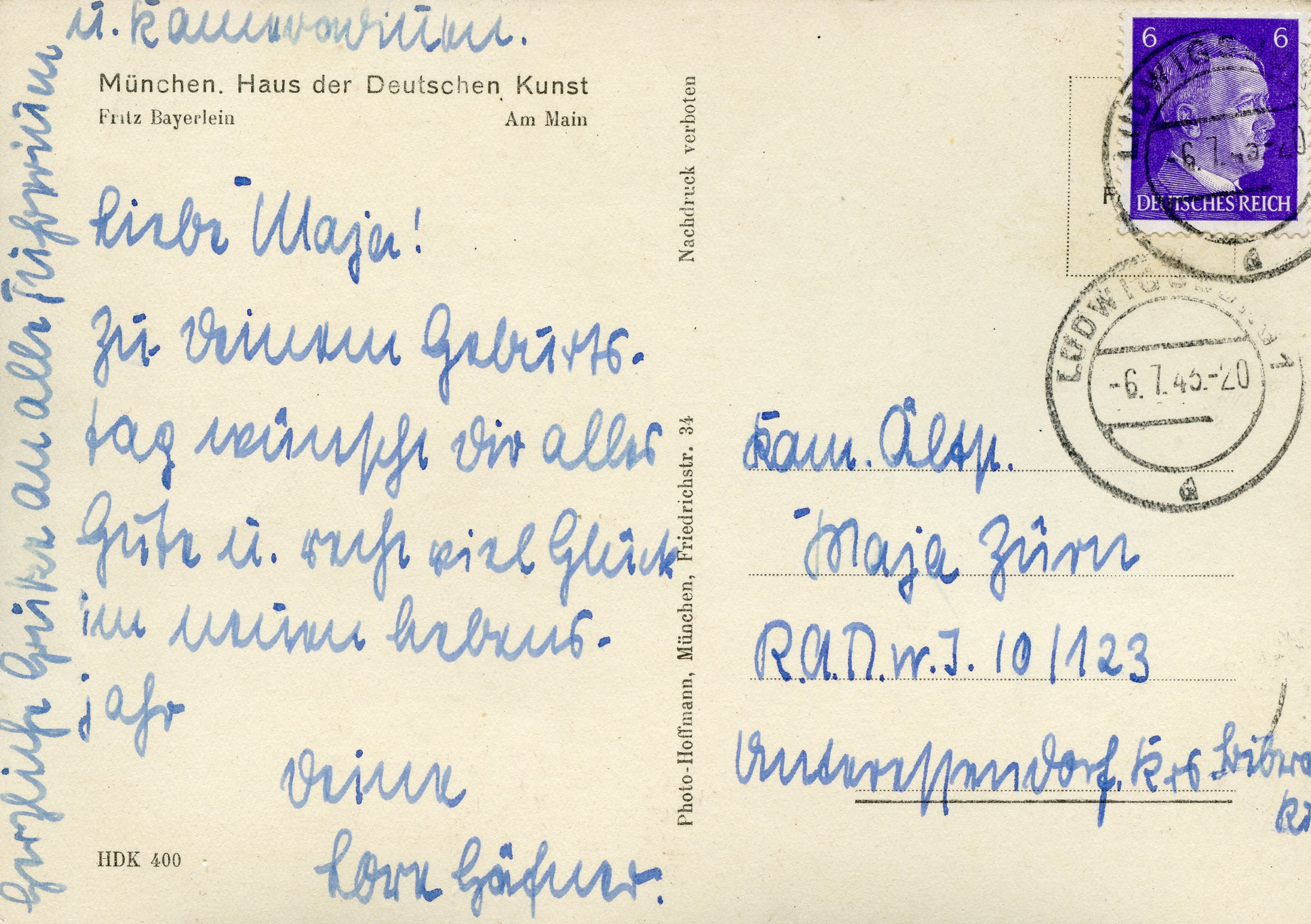 [Below: Postcard reverse. It was used and canceled on July 6, 1943.]