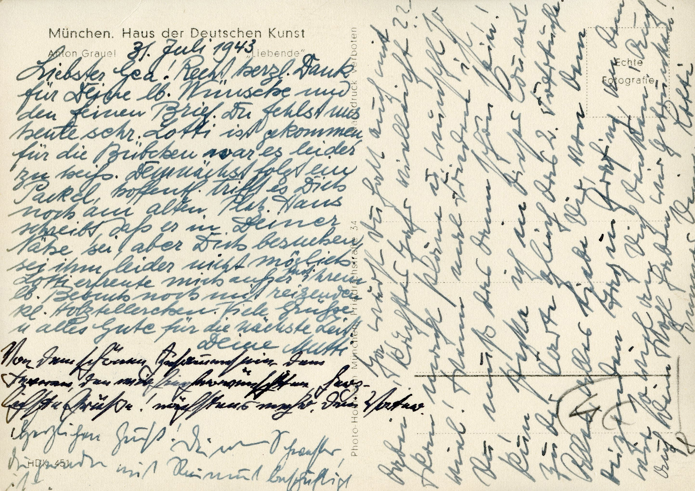 [Below: Postcard reverse. This is written out and dated July 31, 1943, but has no mailing or sender's address. Maybe it was sent within an envelope?]