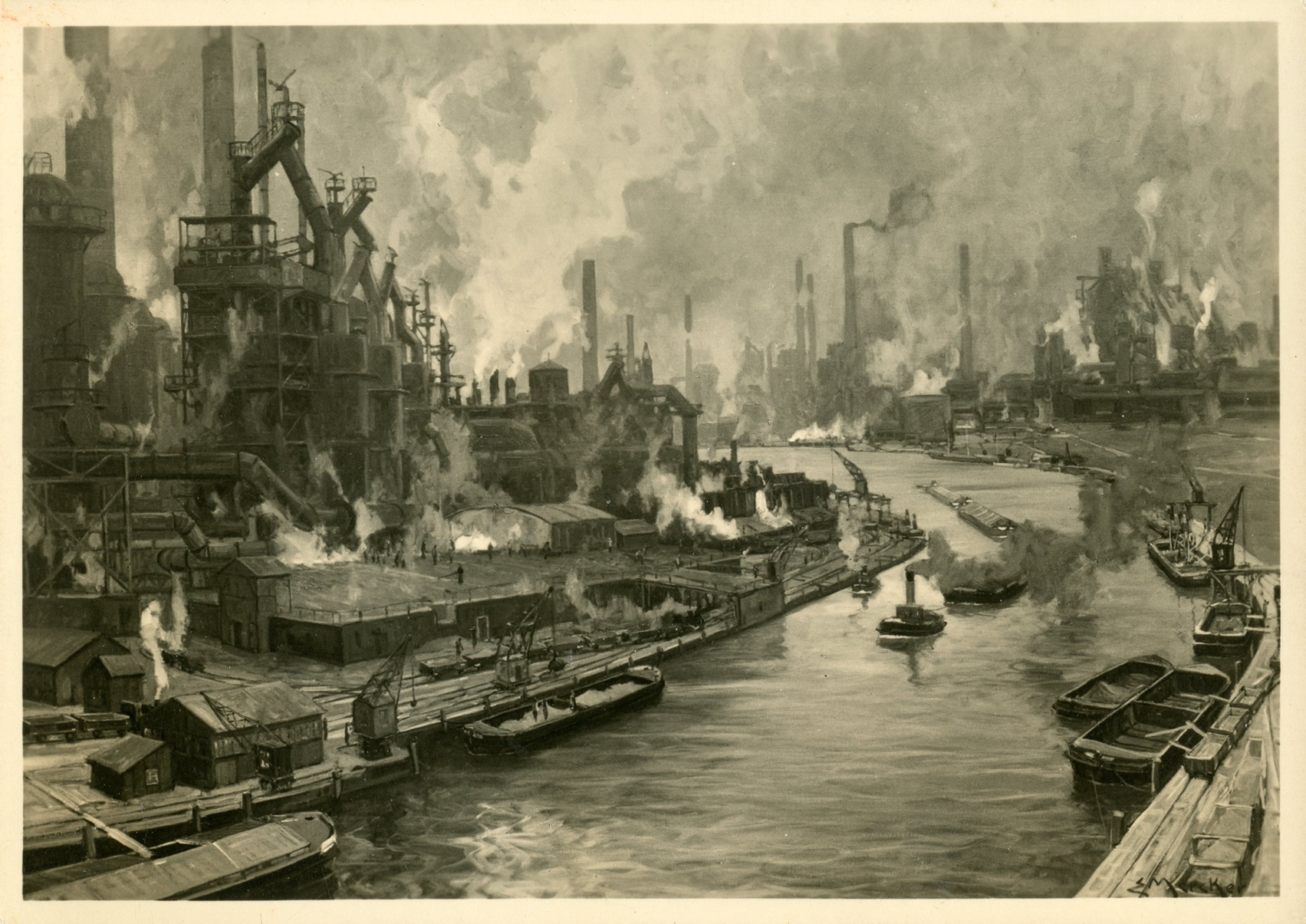 [Above: This was done by the artist Erich Mercker, from [unknown], entitled 'Im Reich der Hochöfen' (In the Realm of the Blast Furnaces).]