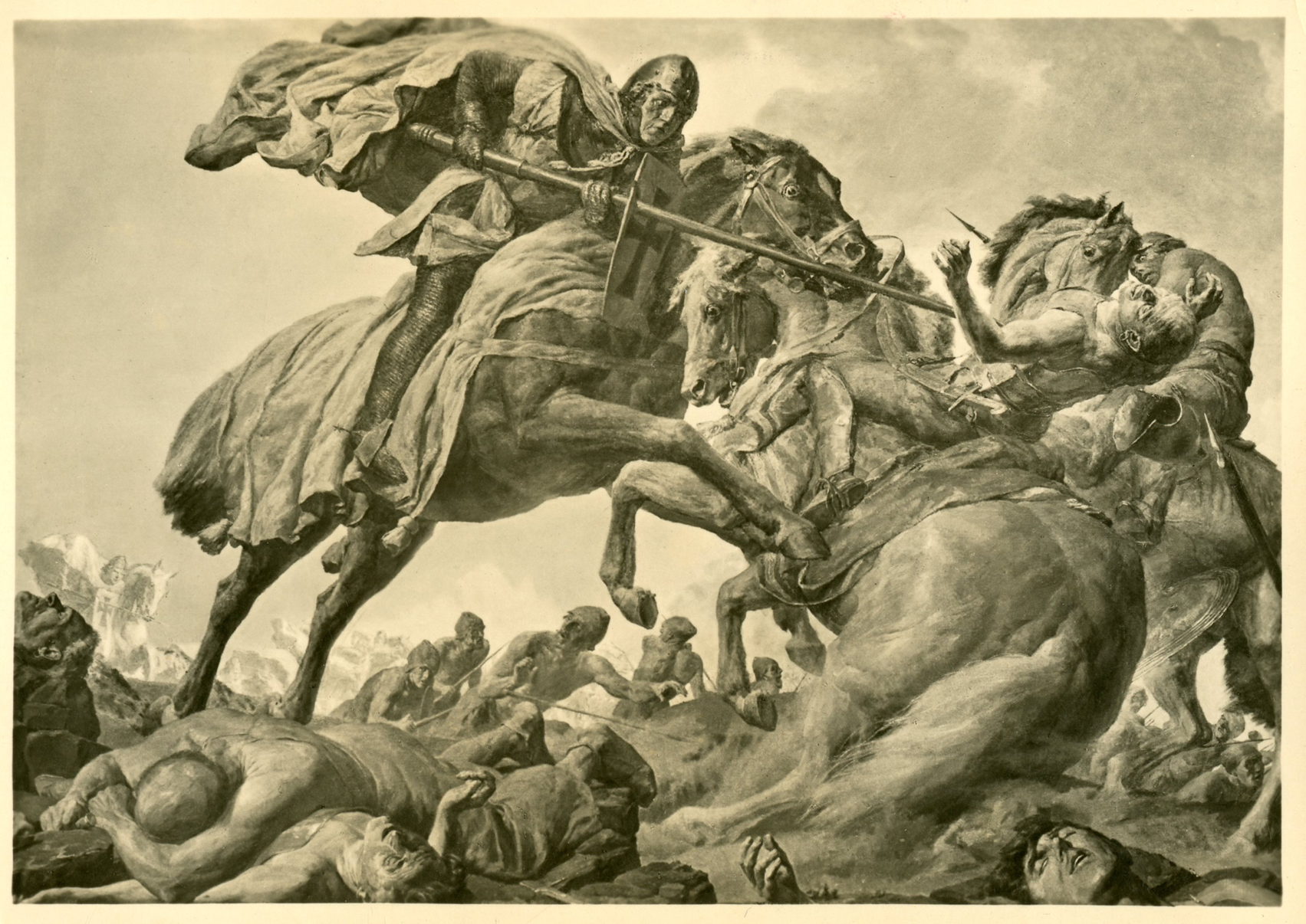 [Above: This was done by the artist Ferdinand Staeger, from Trebitsch, entitled 'Abwehr ostischer Einfälle' (Defense Against Eastern Invasions).]