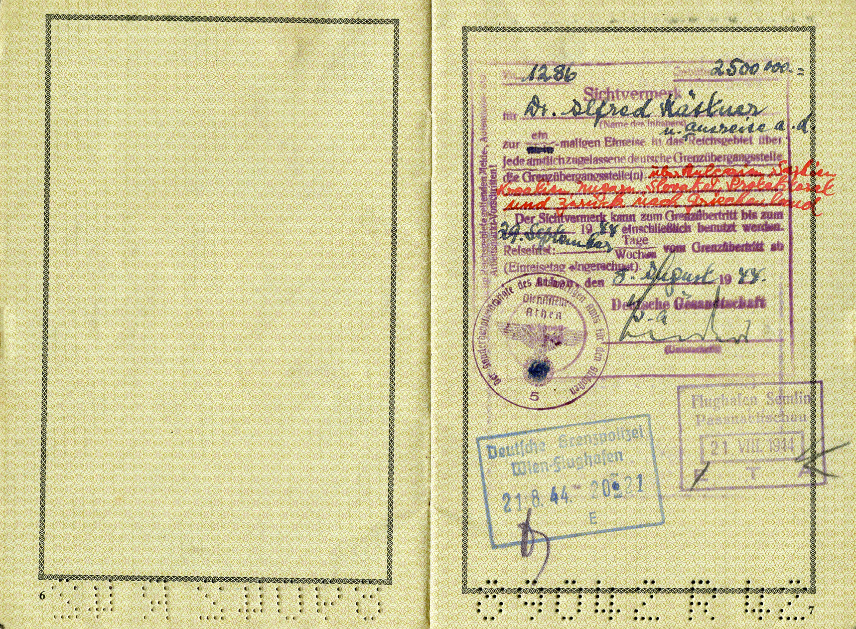 [Below: This looks like it was an entry into the Vienna airport, with permission to cross over the borders of Bulgaria, Serbia, Croatia, Hungary, Slovakia, Bohemia and Moravia (Czechoslovakia)and return to Greece. It's interesting how he had some very wide-ranging permissions during late wartime. For such a tight grip on journalism, they tell us that Germany had, they sure did let reporters travel very freely.]