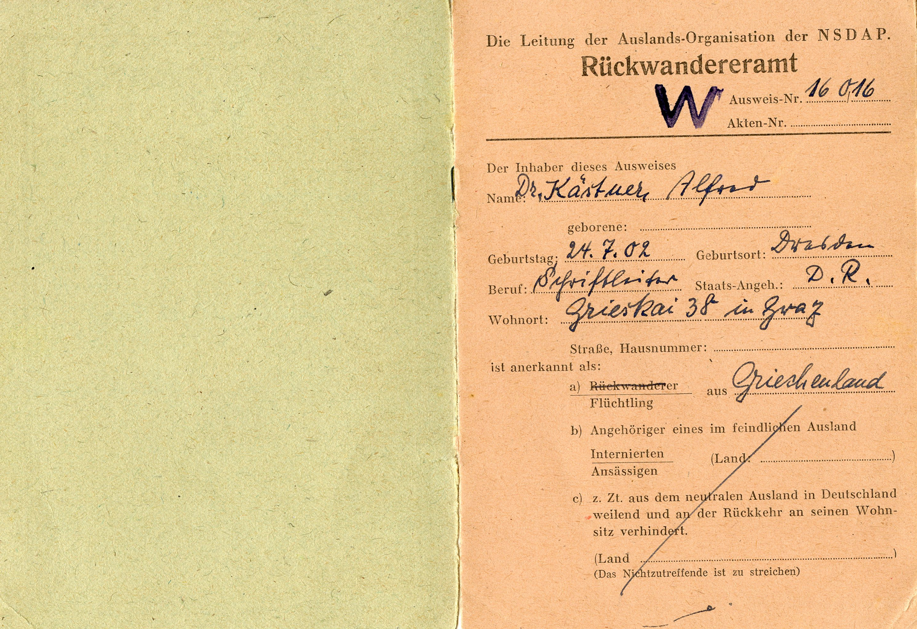 [Below: This is interesting in a few ways. First he lists his address as no longer in Hamburg (Germany) but Graz (Austria). Other than that this contains his basic information, except for 'ist anerkannt als Flüchtling aus Griechenland' (is recognized as a refugee from Greece). So this is from Dr. Kästner's return from Greece as a refugee.]
