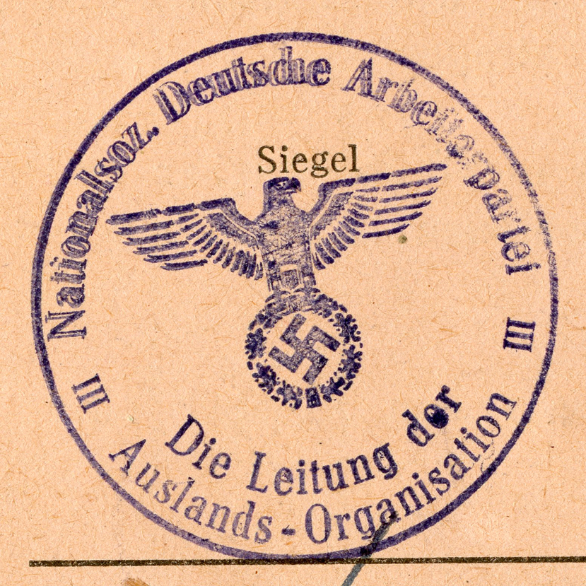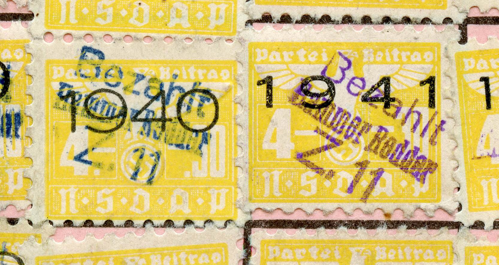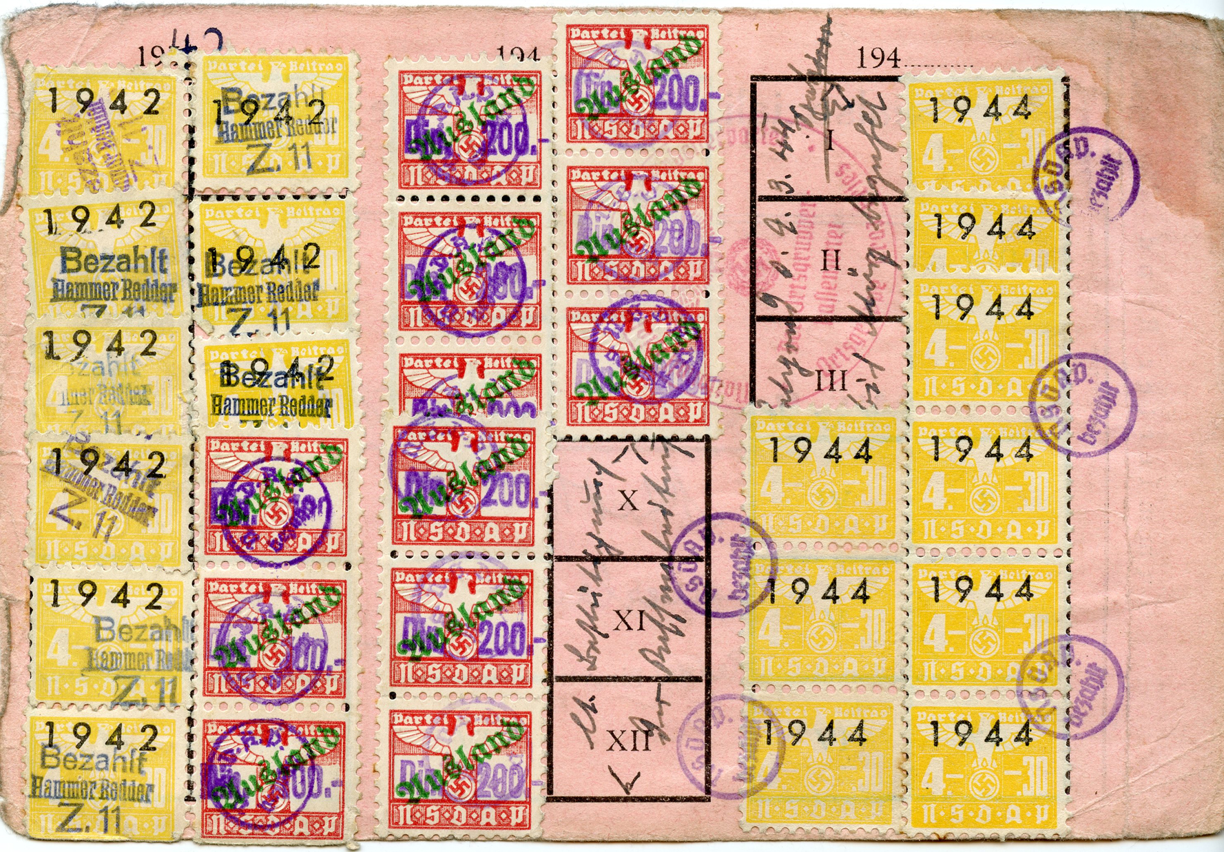 [Below: (left) Ausland dues stamps close-up. (right) 1944 dues stamps close-up. I like this little 'NSDAP bezahlt' cancel shown here.]