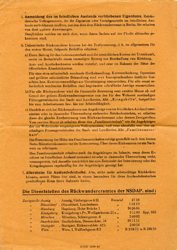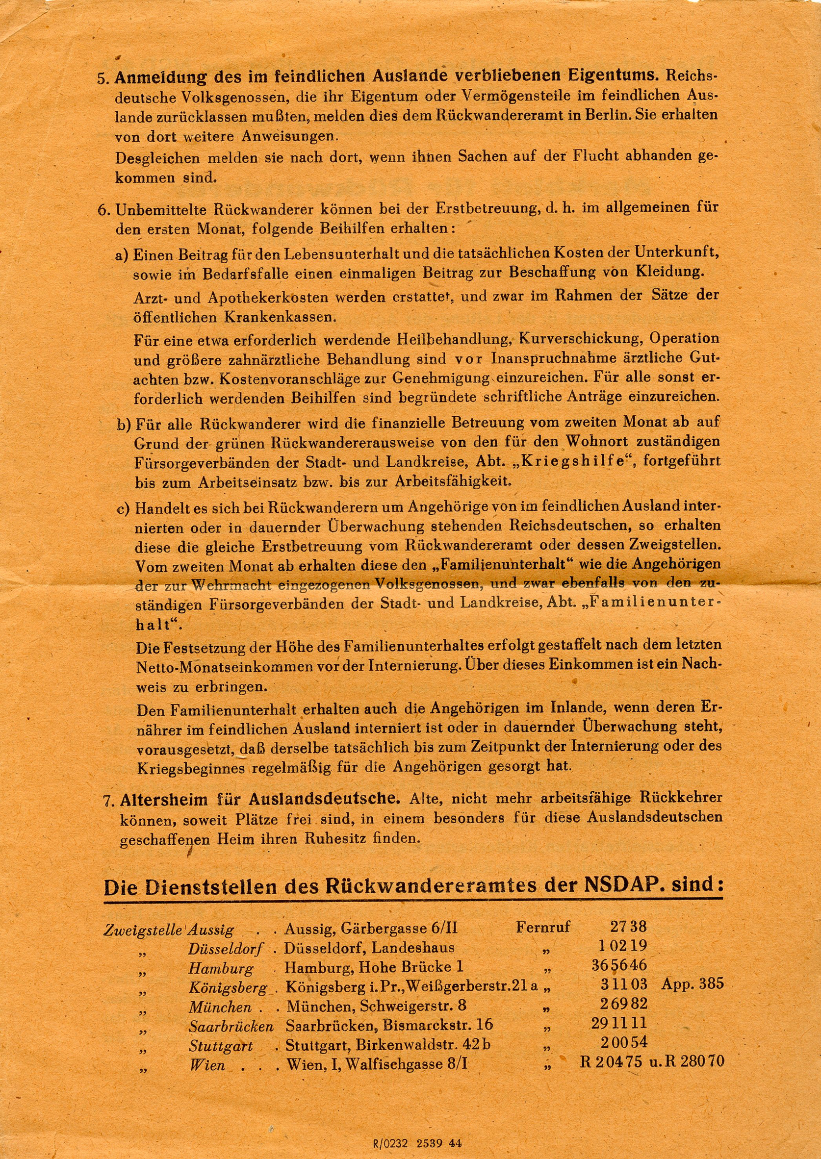 [Below: Reverse of above sheet. This talks about 'Registration of property left behind in enemy countries. Reich German nationals who had to leave their property or assets behind in enemy countries must report this to the Repatriation Office in Berlin. They also should report if they lost anything while fleeing.' This goes on to talk about help with living expenses, help with clothing costs, doctors and pharmacy fees, further stating that any necessary medical treatment, transfer to a health resort, surgery and major dental work should be submitted first for approval. Also of interest, it talks about if relatives of Germans interned in enemy countries, or under 'permanent surveillance' (probably like the thousands of men and women interned in Allied countries for no other reason than their race or their political beliefs), that they will receive 'family support' like the relatives of national comrades drafted into the Wehrmacht. Lastly it informs that retirement homes are available for Germans from abroad, saying 'Old returnees who are no longer able to work can, as long as places are available, find their retirement in a home created especially for these Germans from abroad.' What a beautiful past...]