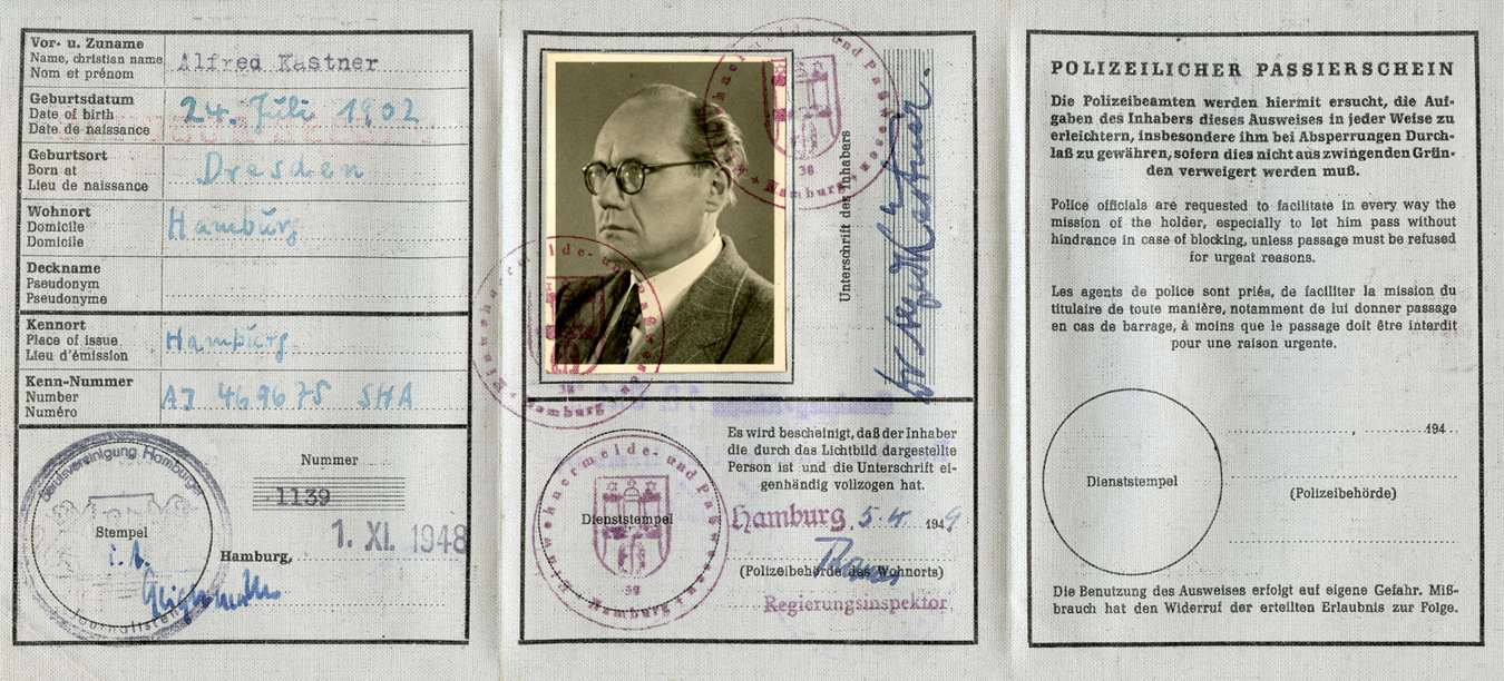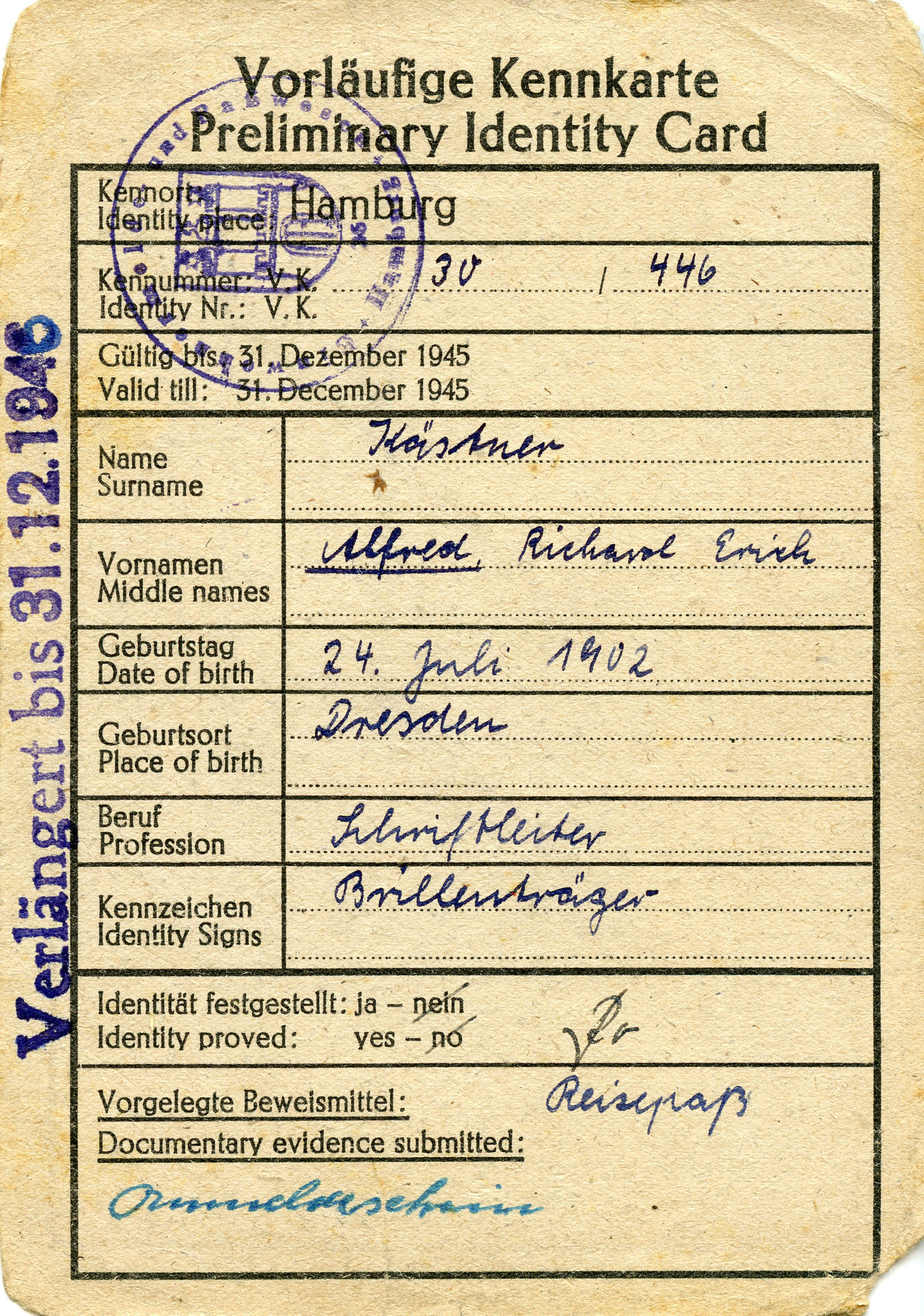 [Below: This is a very early Allied identification ID. Kästner reports that he is back in Hamburg. This 'Preliminary Identity Card', from October 1, 1945 (strange synchronicity that when I am writing this it is October 1st) states that his identity is proven with his travel passport.]