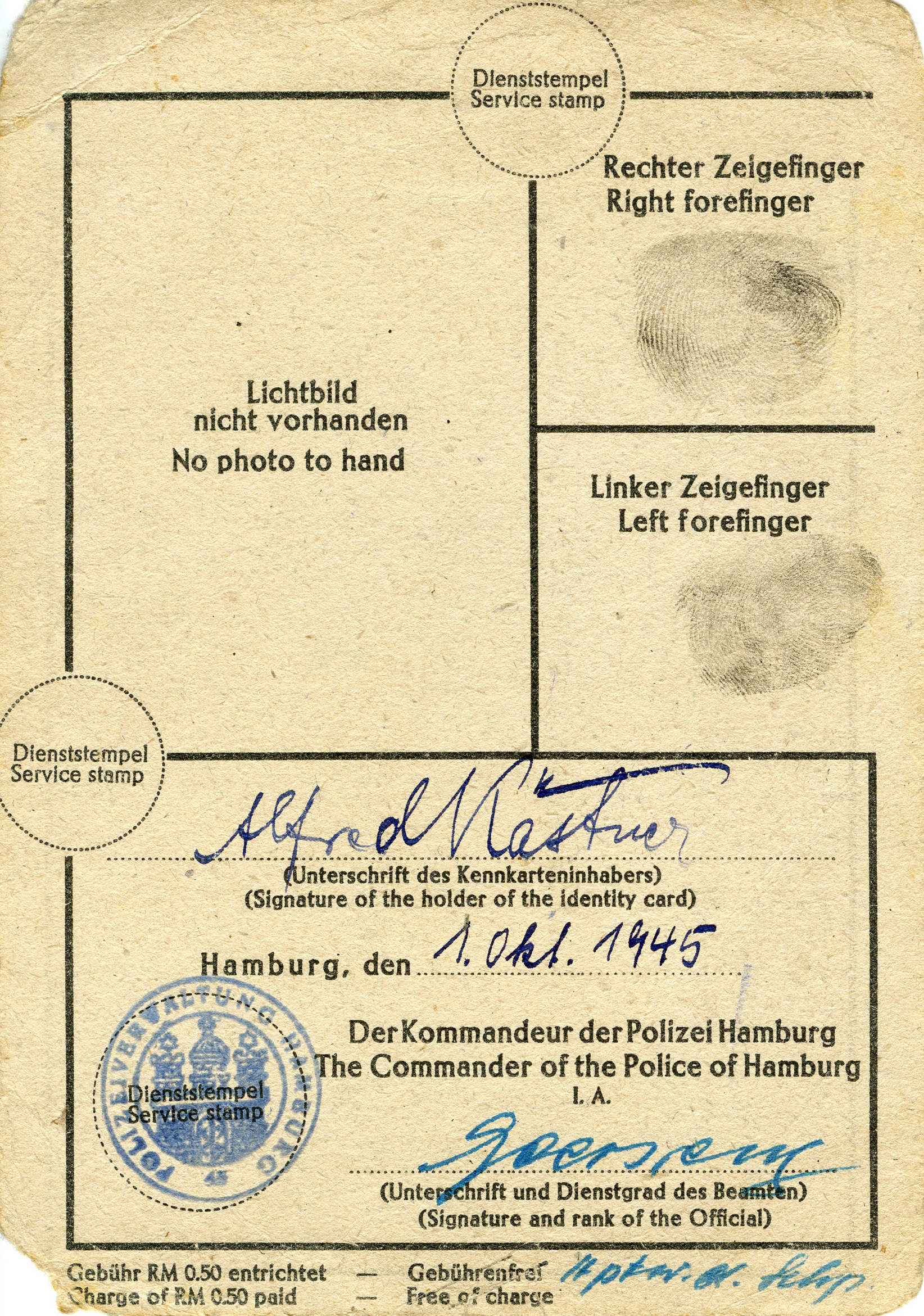 [Below: A Hamburg 'Refugee ID' card for Alfred Kästner. I'm unsure why he would still need a refugee ID card four years after the war.]