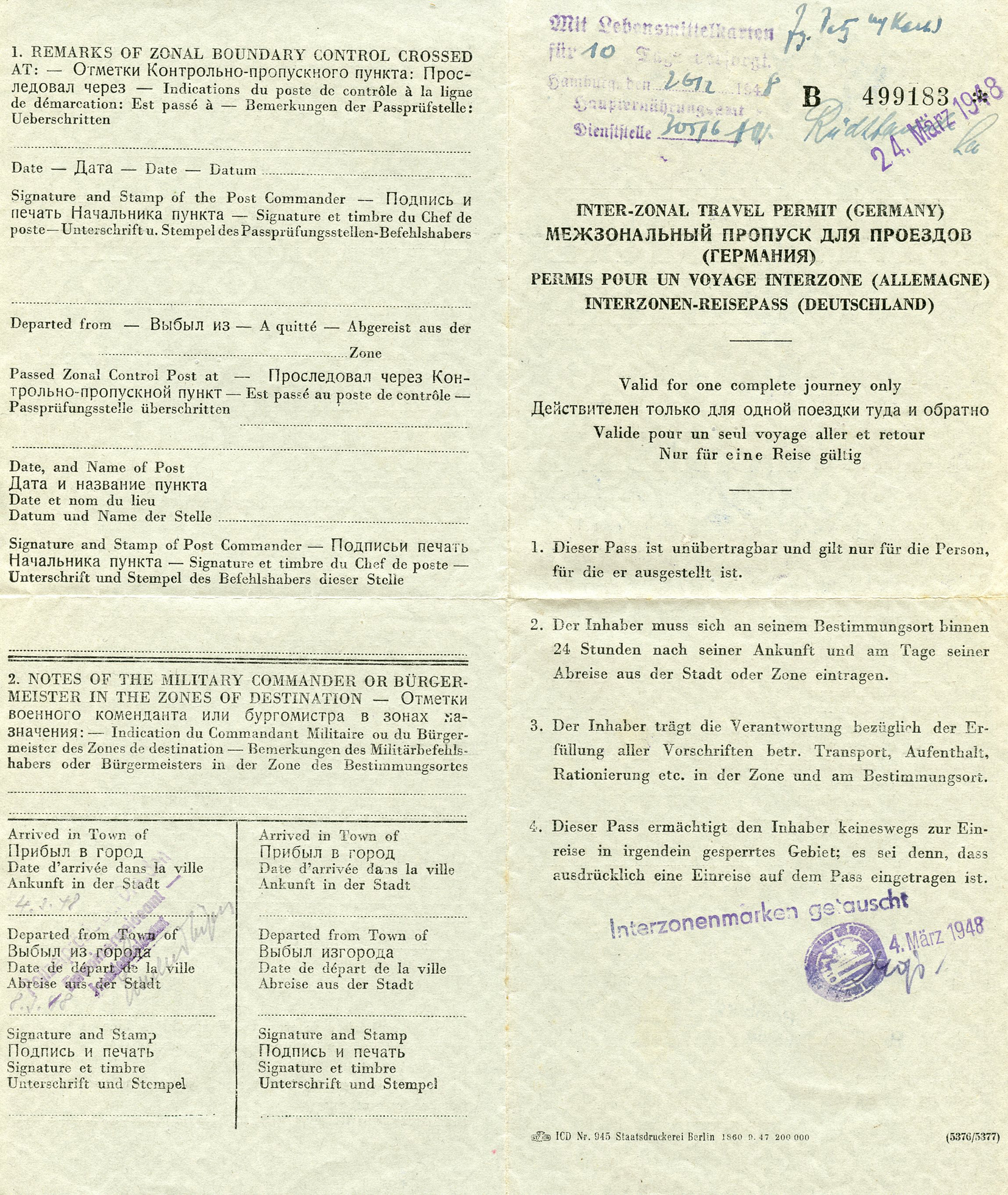 [Below: Front and reverse of an 'Inter-Zonal Travel Permit', in Russian, French and English. The languages of the 'victors', nevermind France was completely conquered, Britain would have been conquered without the help of the USA, and the same can be said of the Soviet Union. Without Lend-Lease the Soviet Union would have crumbled, not to mention the American blockades against Germany. This was issued on March 4, 1948.]