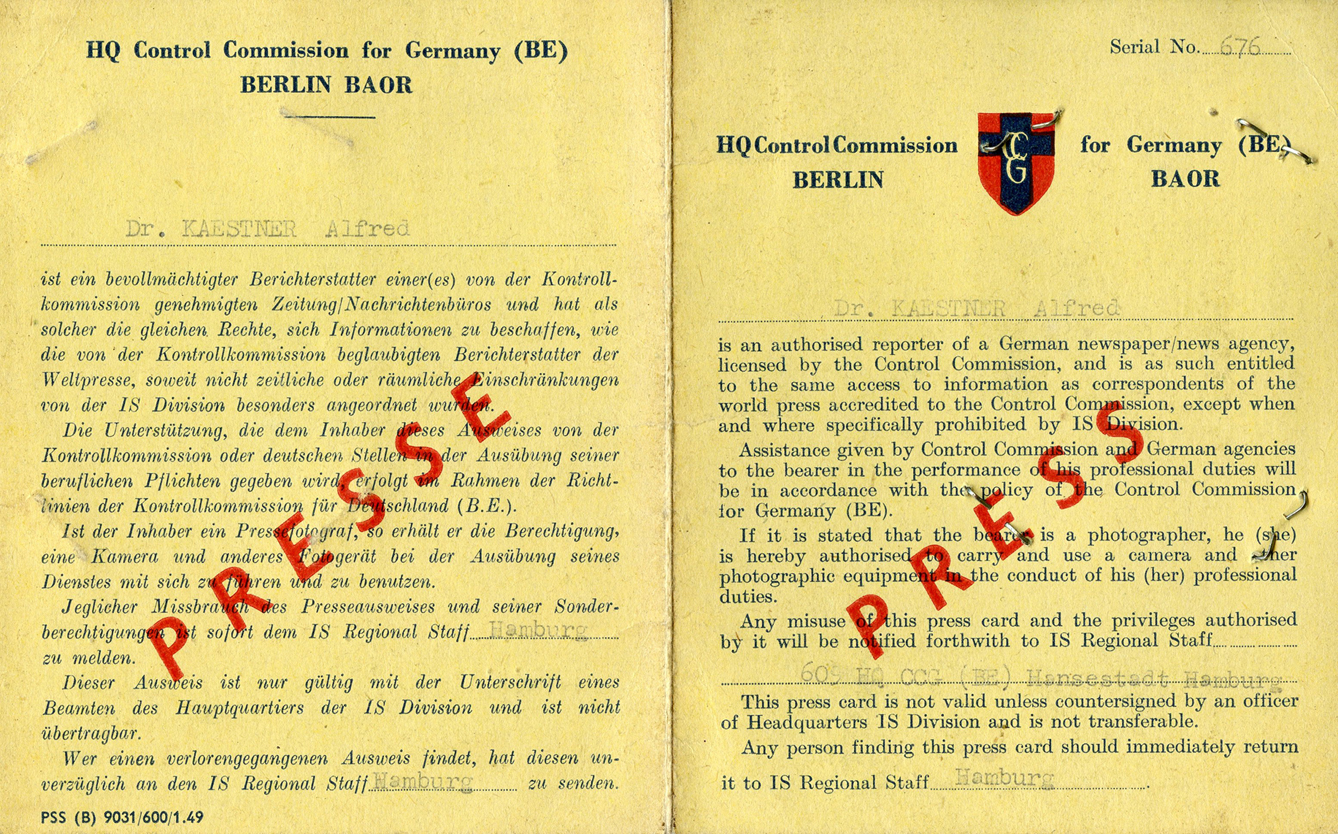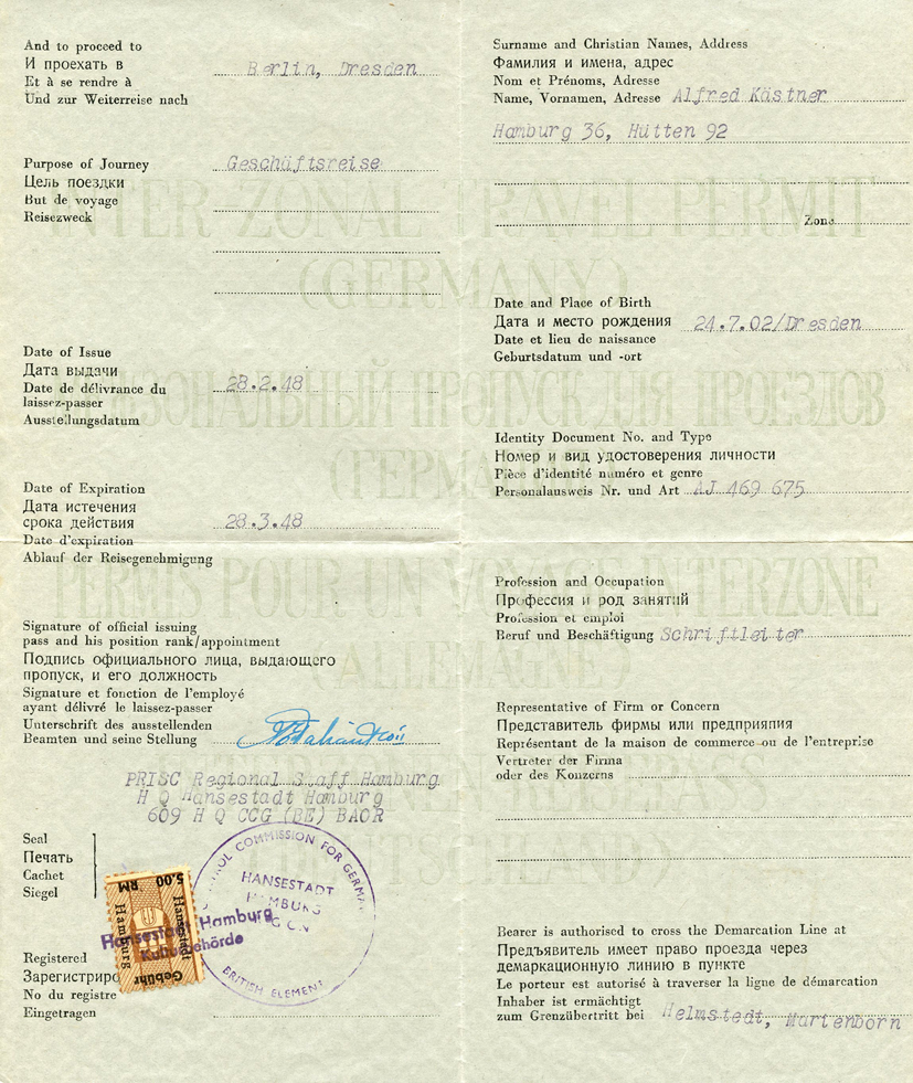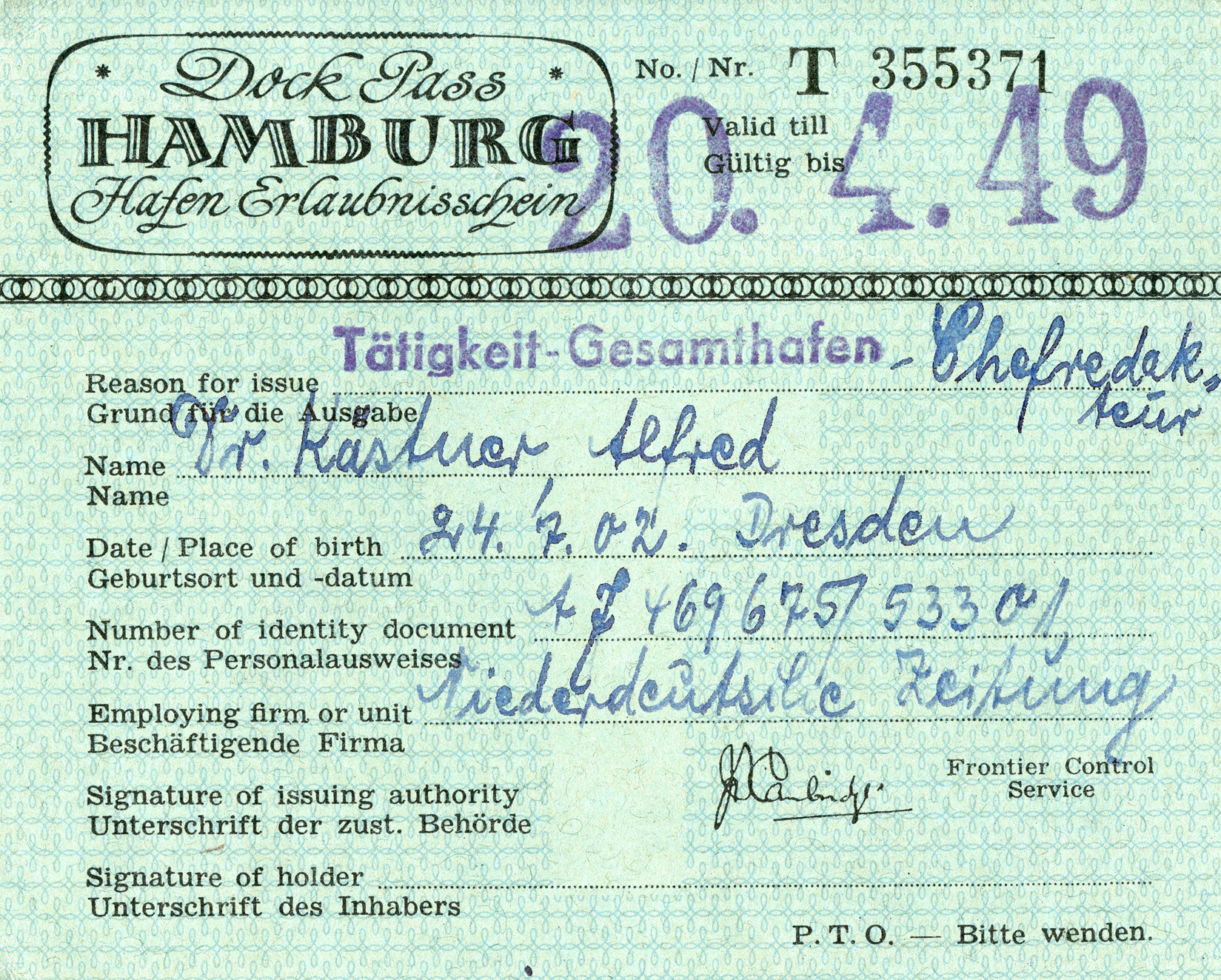 [Below: This is interesting, it says 'Permanent Business Trip Certificate' used for 'obtaining admission tickets for certain trains in the British Occupation Zone' from February 1947, to 'conduct professional business'. This lists Dr. Kästner as a resident of Hamburg, who worked for the Niederdeutsche Zeitung (Lower-Germany Newspaper).]