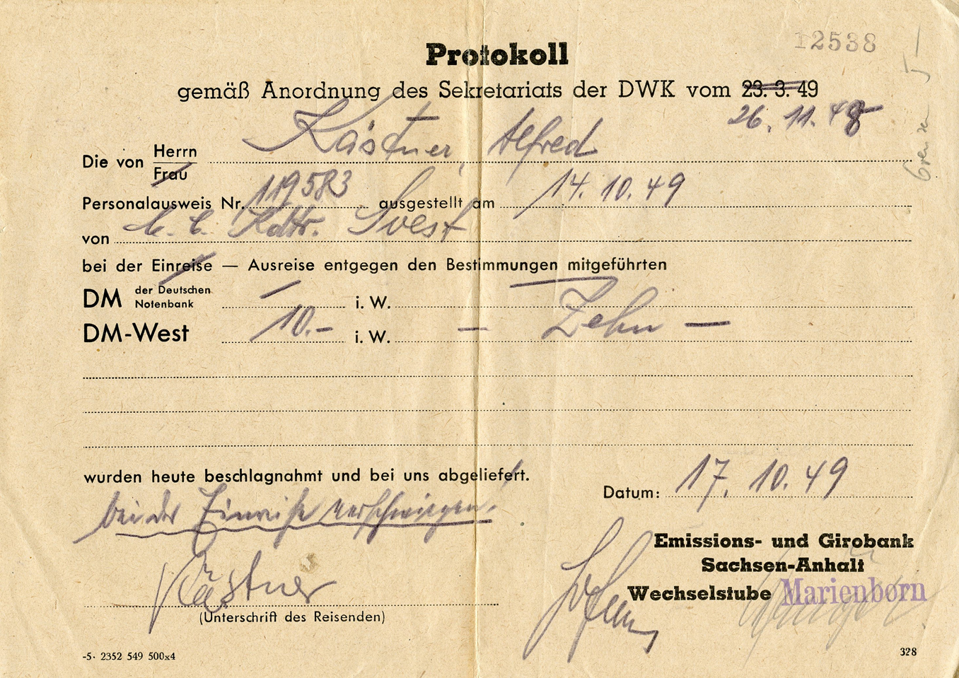 [Below: An odd little piece of paper... this is from October 1949 detailing how the doctor broke regulations of carrying 10 Deutsche Marks over the border.]