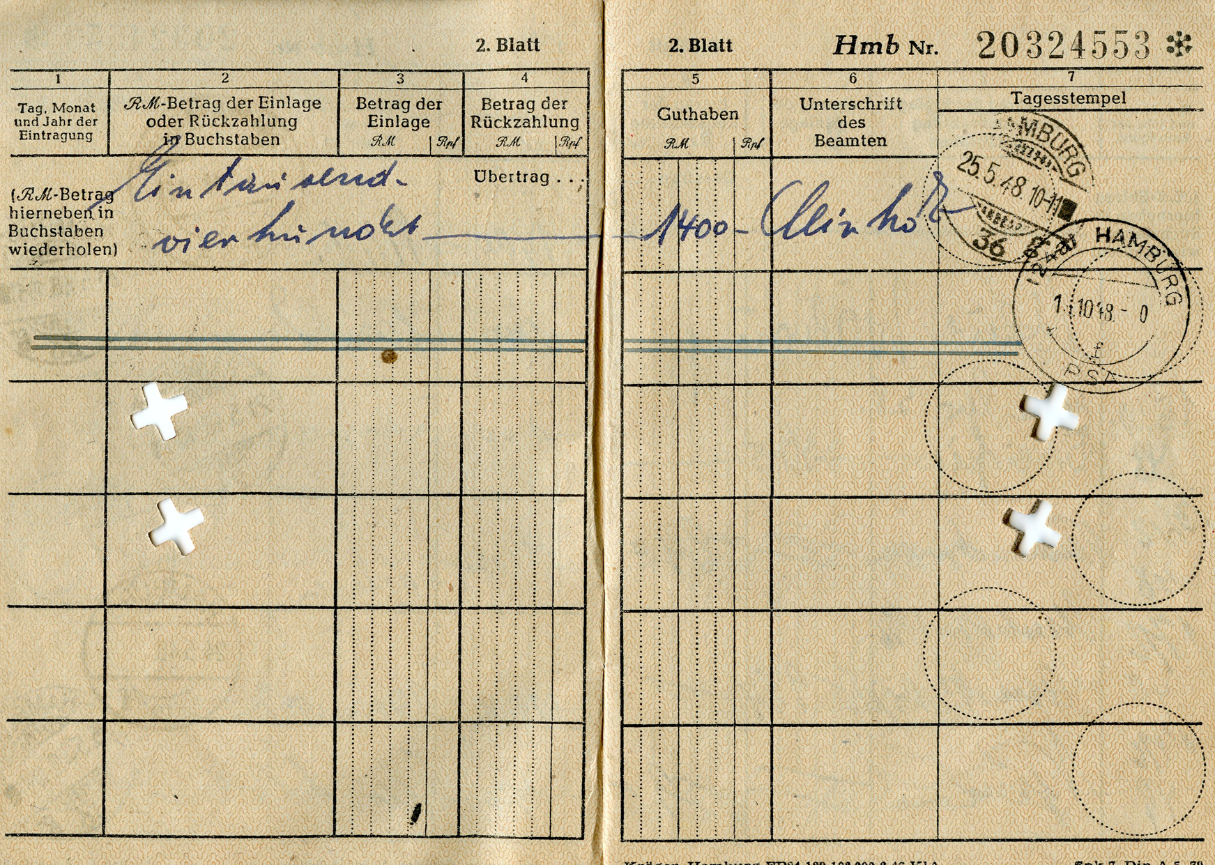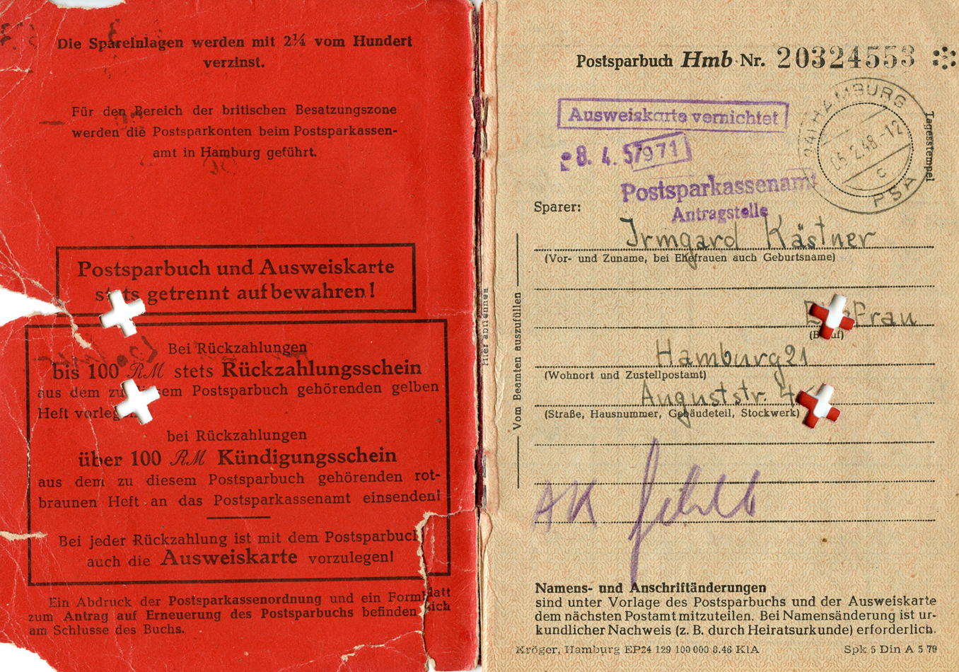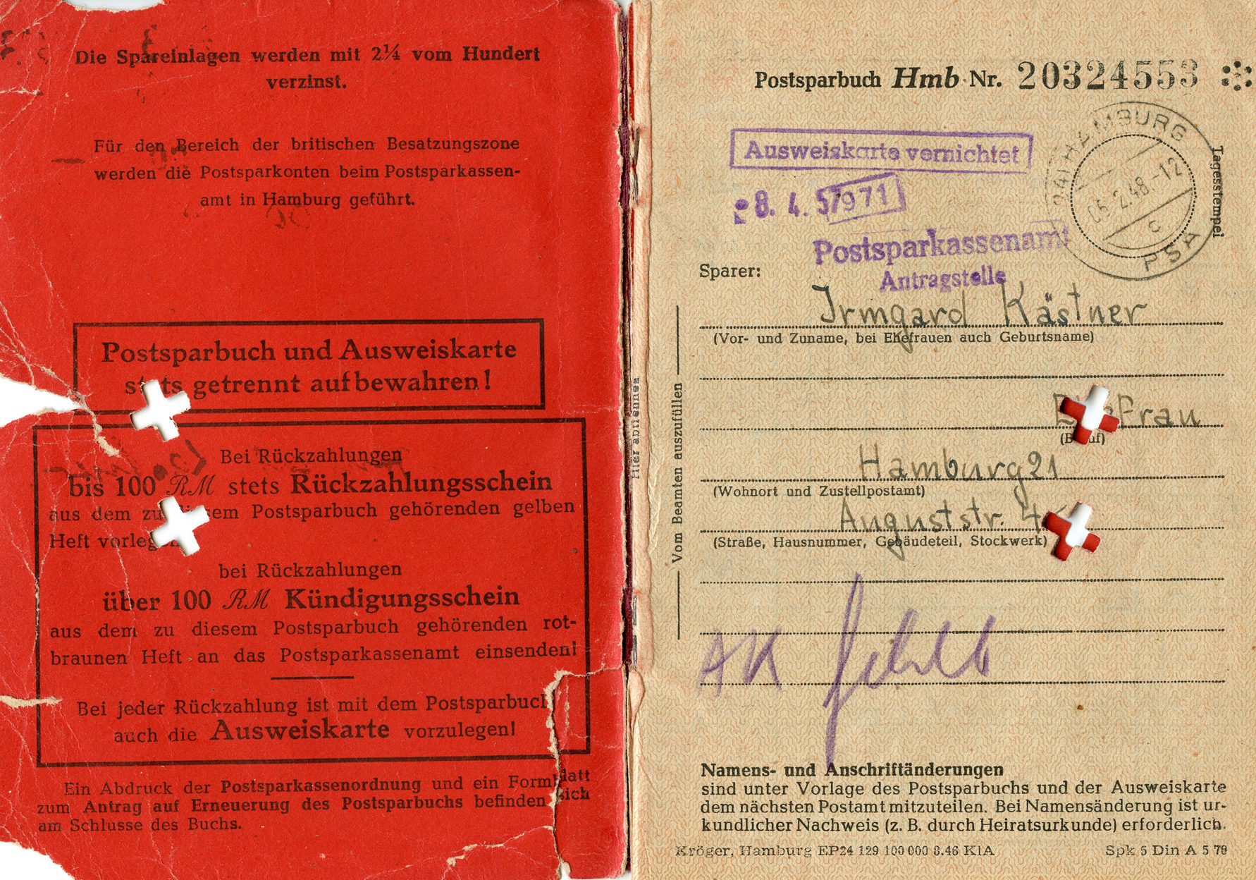 [Below: This is a Hamburg, British Zone, savings book from the Doctor's wife, Irmgard, from 1948. The account was closed on April 8, 1957.]