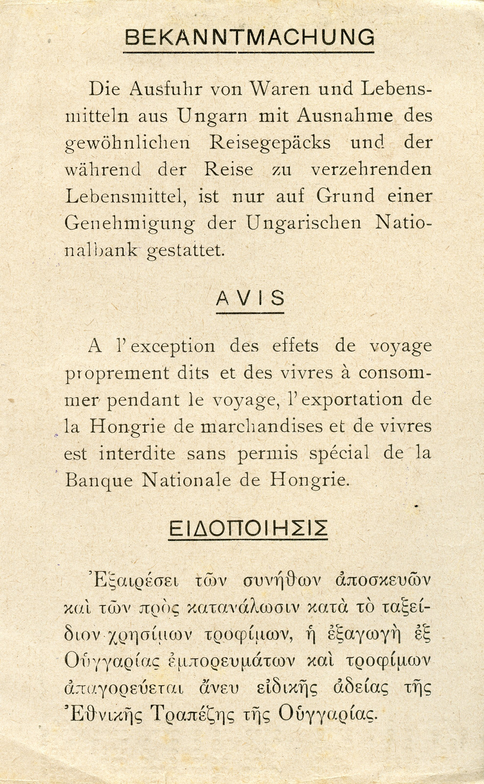 [Below: This strange paper was included and basically says food taken from Hungary, unless to be eaten immediately on the trip, is not allowed, unless permitted by the National Bank. National Bank? Wtf?]