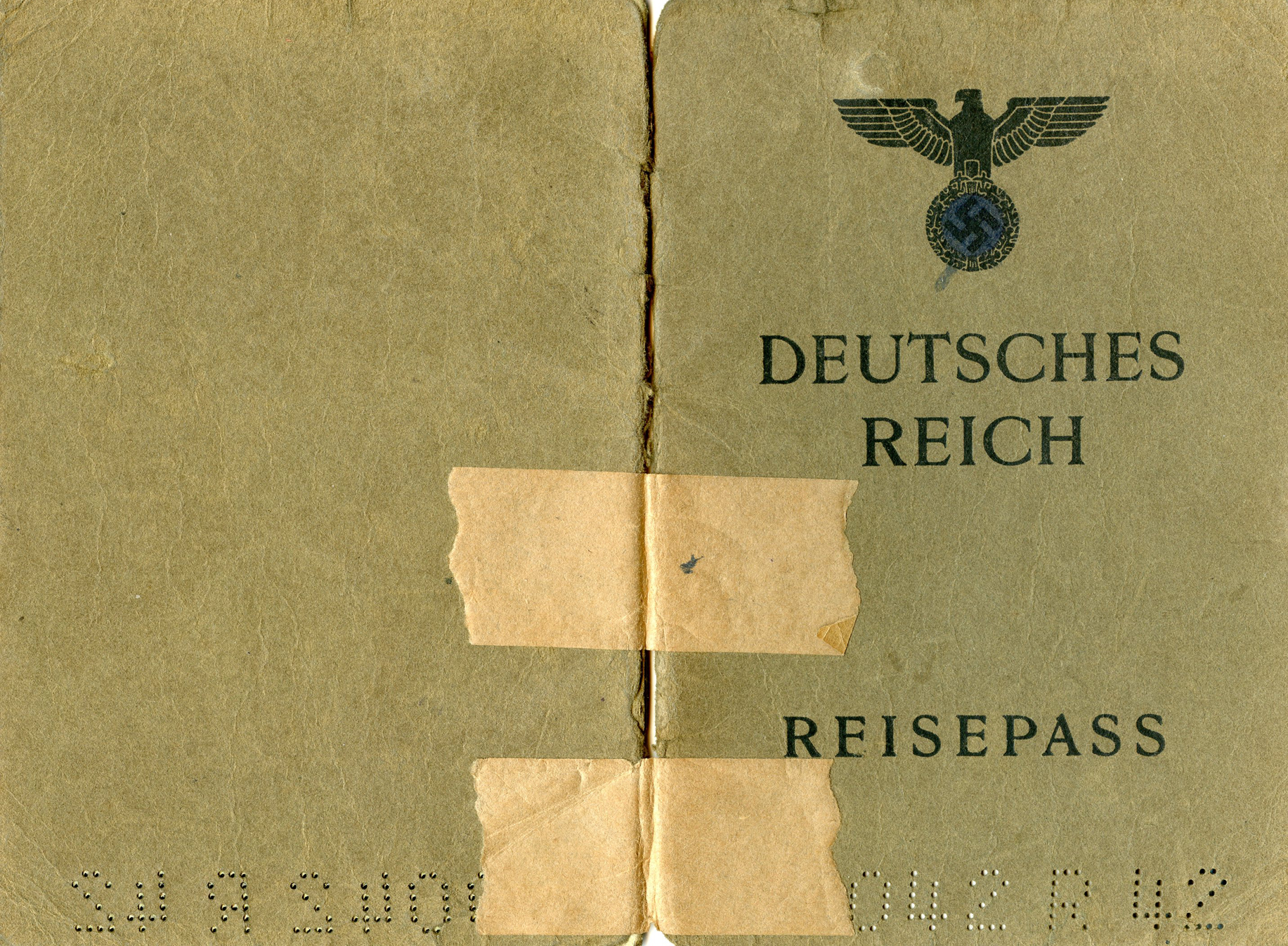 [Below: This is a Third Reich 'Reisepass', or passport. You can see that this has been 'de-Nazified' after the war, per Allied order, by having the swastika scribbled out.]