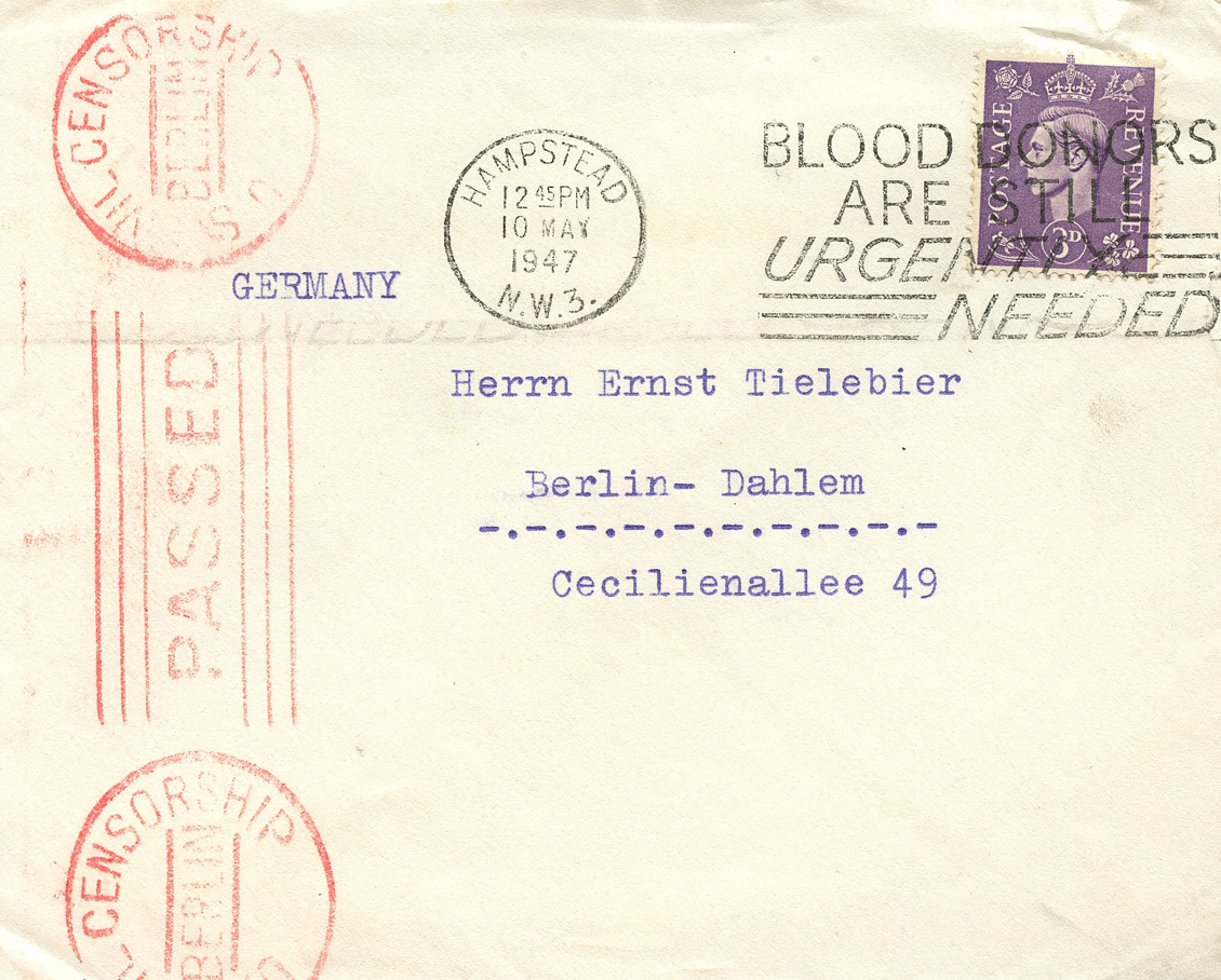 [Above: This appeal for blood was canceled in Hampstead, England on May 10, 1947 and sent to Berlin, where it was censored (probably removed the bloodthirsty begging and conniving for blood).]