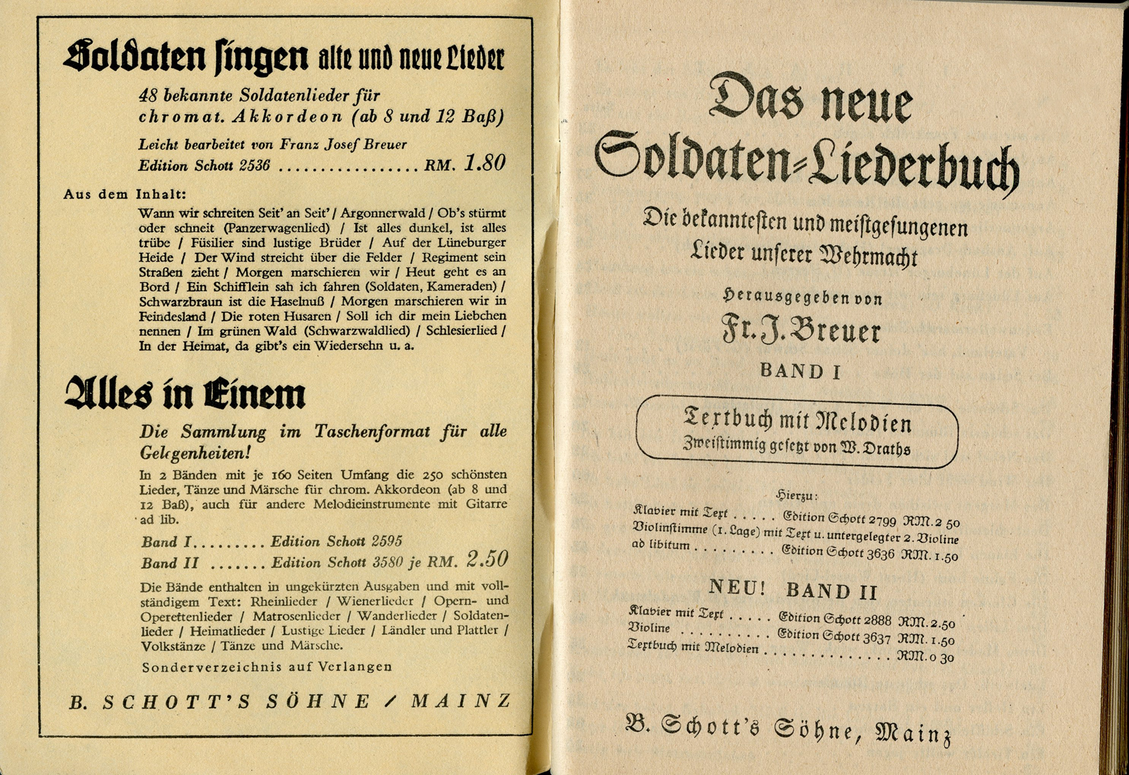 [Below: Inside of Das Neue Soldaten Liederbuch (The New Soldier's Song Book) showing Horst Wessel Lied.]