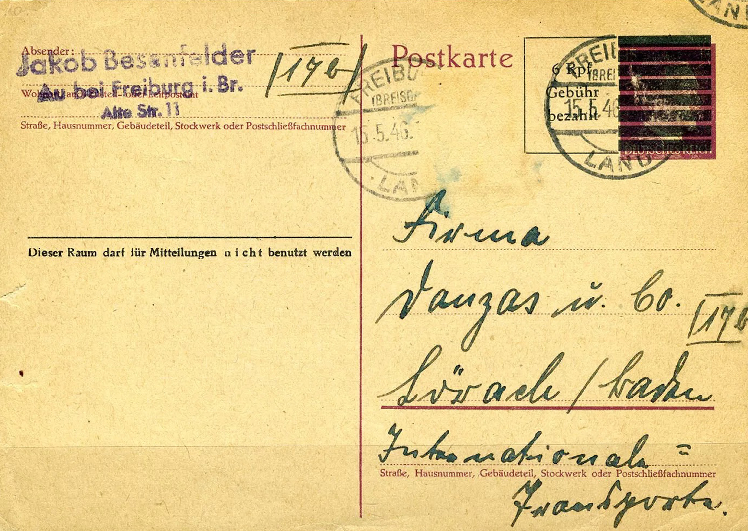 [Below: Here is an unaddressed postcard with a French zone of occupation postage stamp postmarked on March 20, 1946. This postcard has a deep black Hitler head blackout stamp and a 'Gebuhr Bezahlt' (fee/postage paid) stamp. Click to see more.]