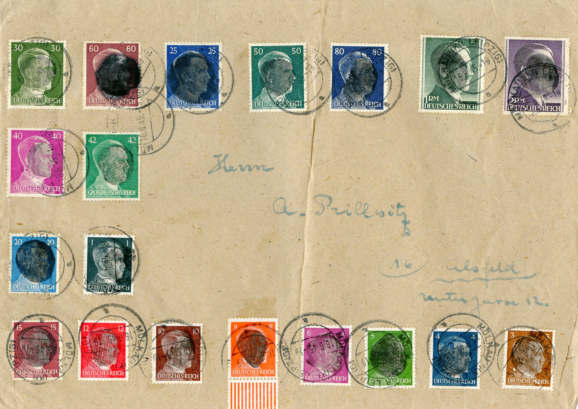 [Below: Here is an envelope done by a stamp collector that shows the wide variety of Hitler blackout overprints. This was done by hand, which is why each overprint looks different. It was postmarked on June 16, 1945.]