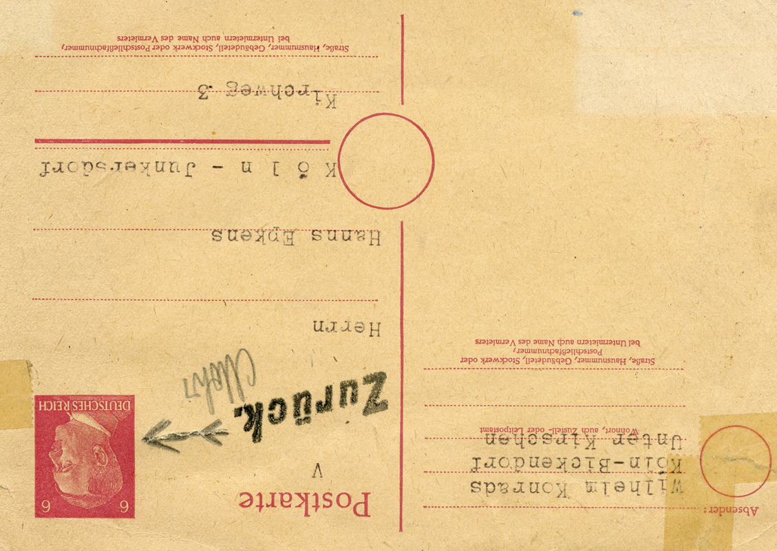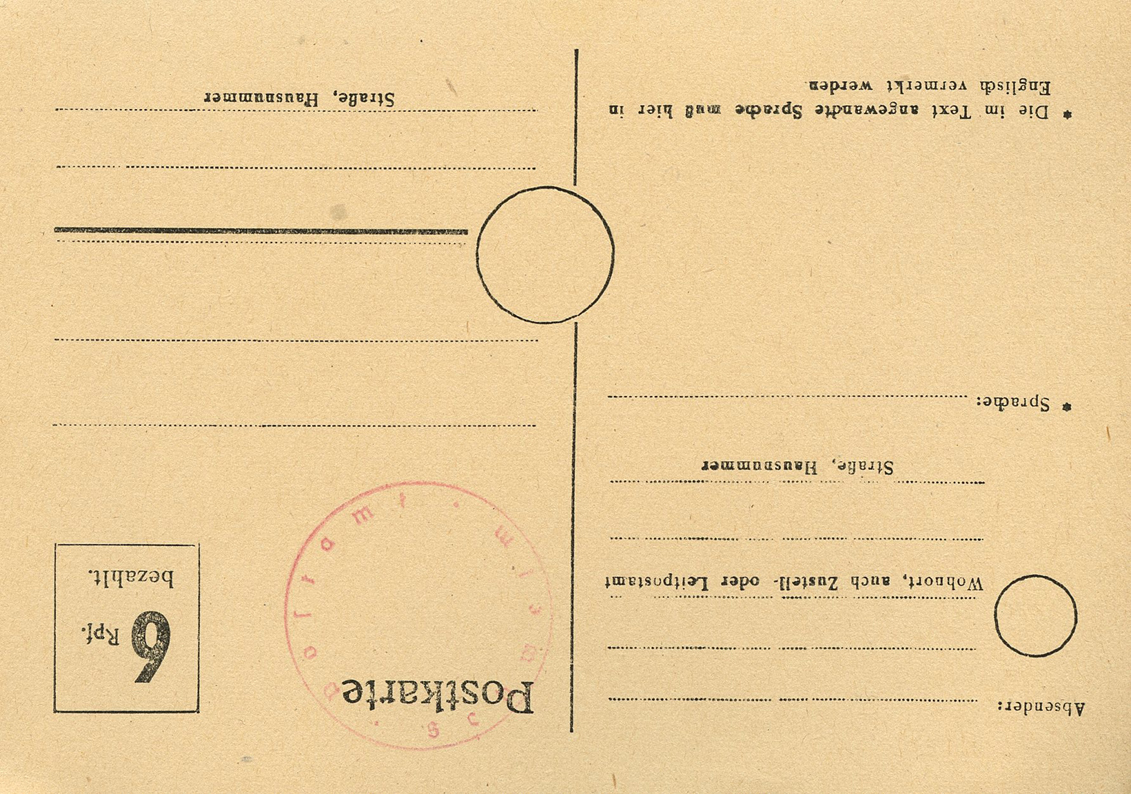 [Below: On this pre-paid (red ink handstamp) postcard they've shaved off the entire eagle and swastika.]