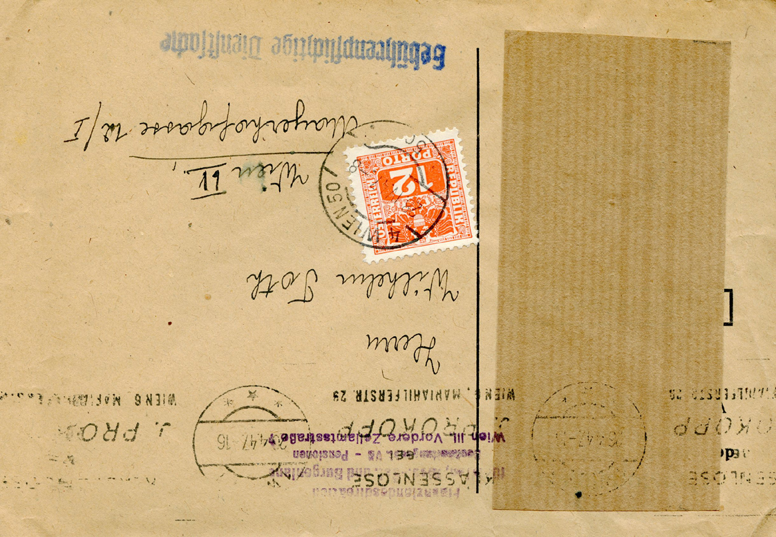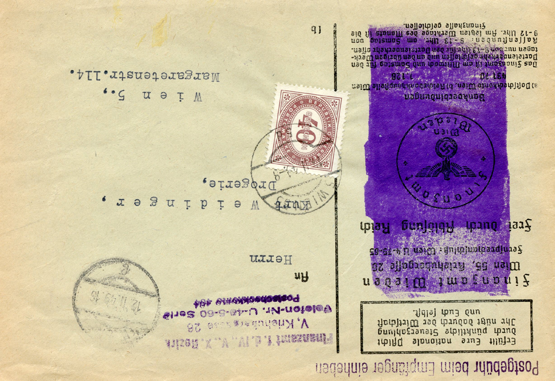[Below: Sometimes Hitler stamps were snuck by the postal authorities, or in this case canceled but not sent. This shows an Allied occupation stamp (with a peculiar hammer and sickle design like that of communism). It was postmarked on August 28, 1945 in Vienna. Click to see more.]