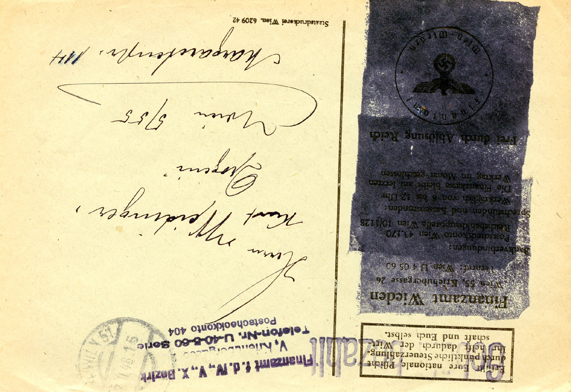 [Below: The next three envelopes show the stupidity and madness of the Allied occupation. Like that above here is an example of attempting to cover up the eagle and swastika on official envelopes. These are from Austria, which had previously voted over 99% to rejoin Germany (it was literally separated by Germany's enemies to make Germany weaker), but voting democratically isn't cool when the tyrants of this world don't like the results. Anyway, here is a piece of tape used to cover the eagle and swastika. This was postmarked on April 26, 1947.]