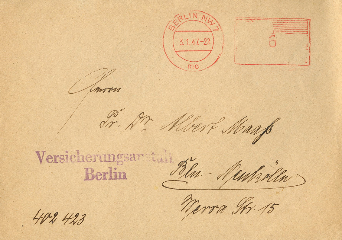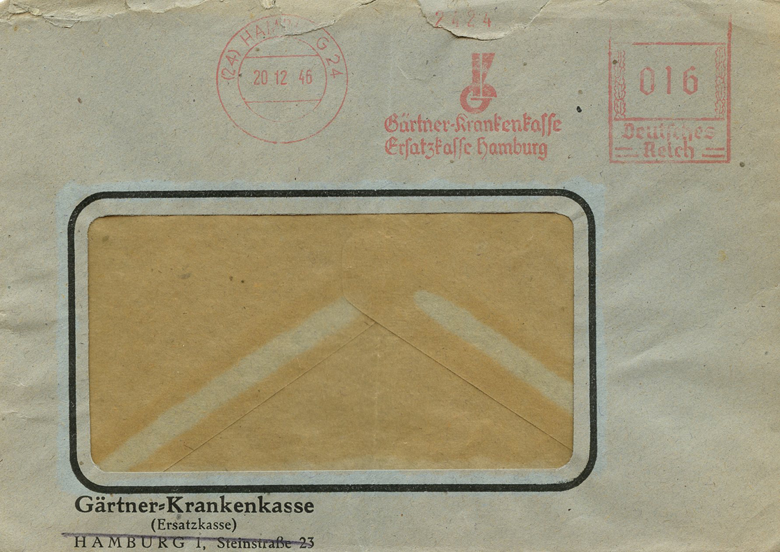 [Below: This also uses a machine cancel meter mail where the swastika has been cut out (atop the box with the 016). This was postmarked on December 20, 1946.]