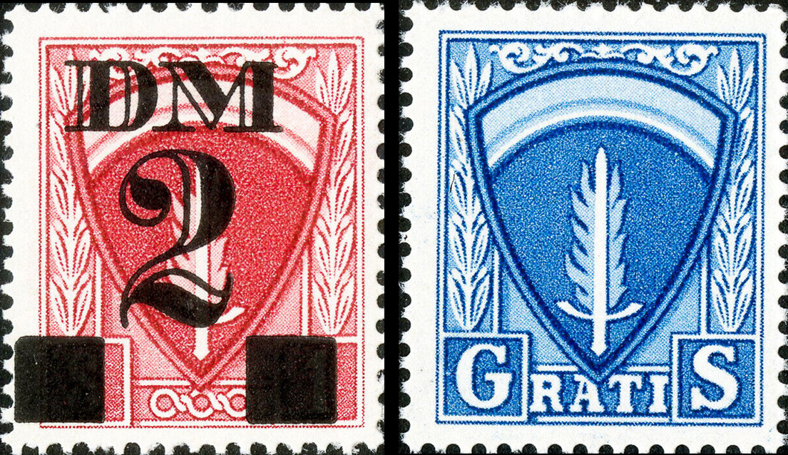 [Below: Allied Military Government occupation stamps. Note the use of a flaming sword. This symbol is used to symbolize 'avenging justice'. Michael, from the Christian bible, is depicted with a flaming sword, he defeated the all-evil Satan with it. Go against their plan for world slavery and you are the next all-evil Satan, just like the 'Nazis' were depicted.]