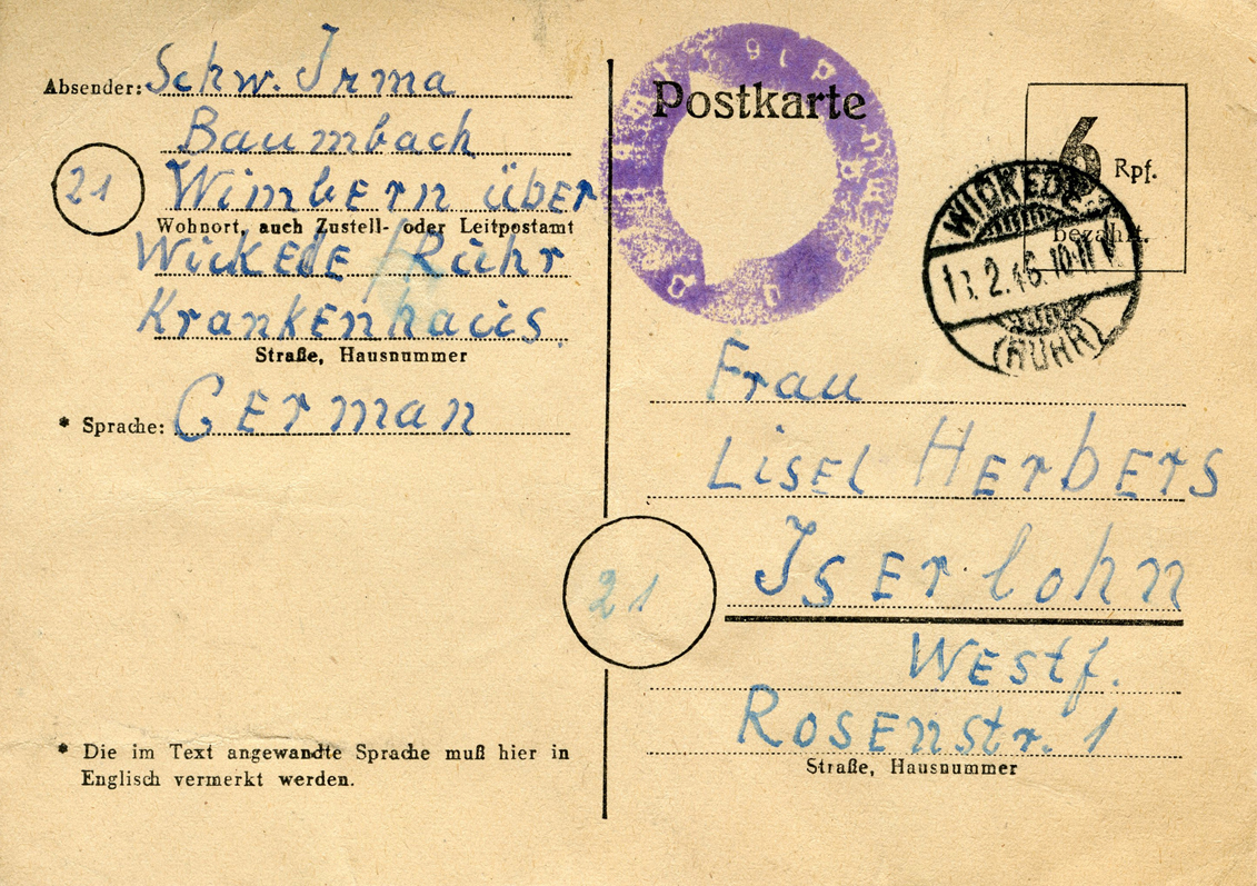 [Below: This time they used blue ink and it hid the forbidden symbol even less. Someone went to an Allied concentration camp for this mistake. This was postmarked on November 12, 1949.]