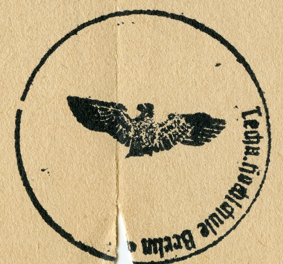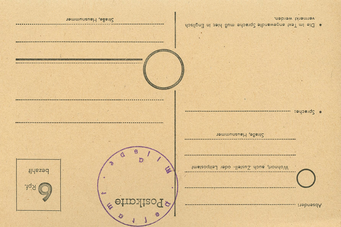 [Below: On this pre-paid (blue ink handstamp) postcard they've shaved off the entire eagle and swastika.]
