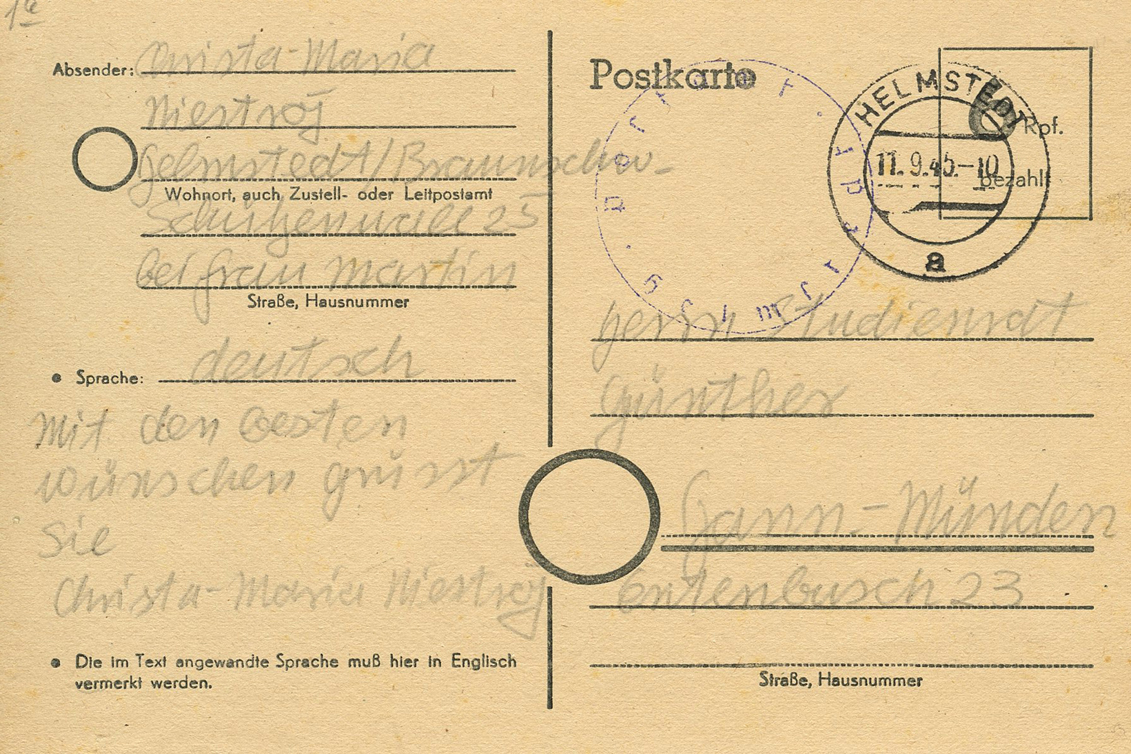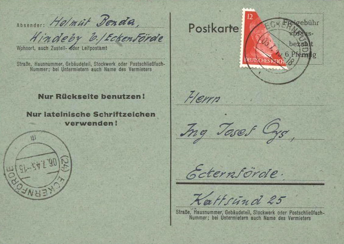[Below: On this pre-paid postcard they've shaved off the entire eagle and swastika. Postmarked on September 11, 1945.]