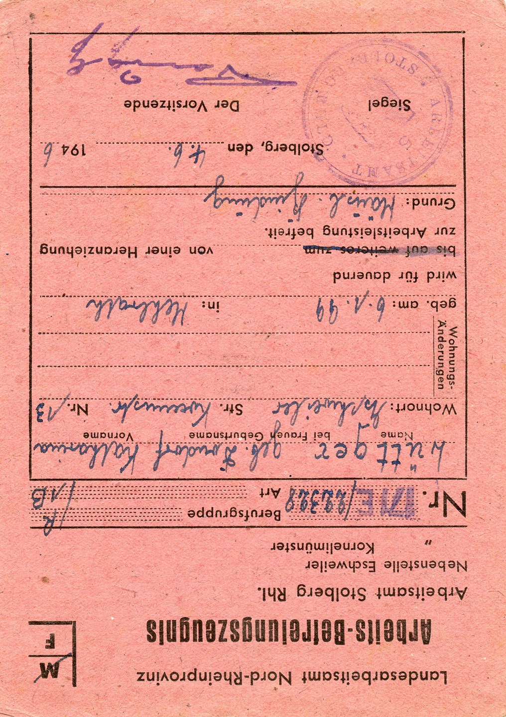 [Below: Work card also for Katherine Lüttger, issued on June 4, 1946. Click to see reverse.]