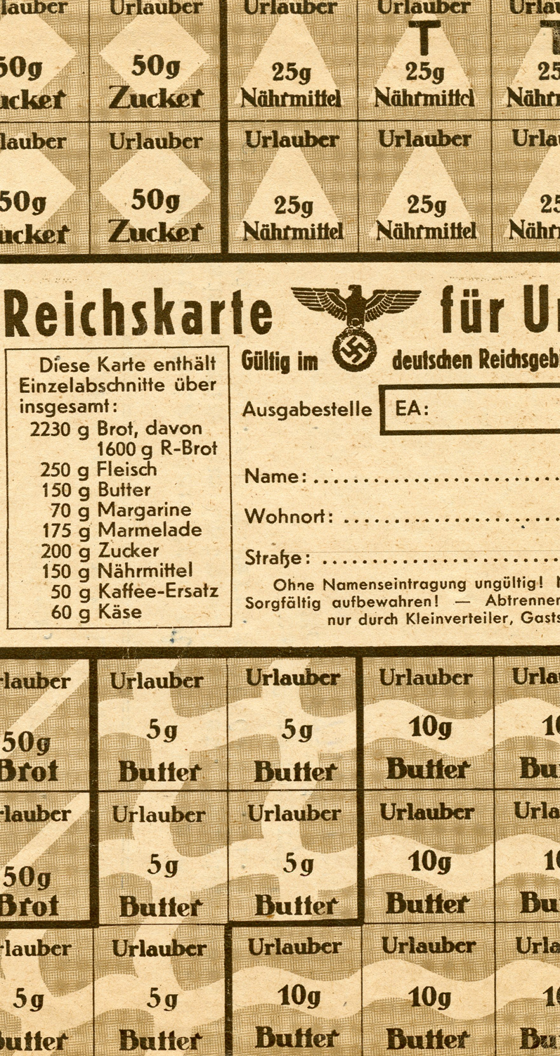 [Below: Reverse of certificate above. Interesting that two years after the war they are still using documents from the Third Reich, in this case a ration sheet. Also strange is that the eagle and swastika haven't been marred or covered. Click to see more.]