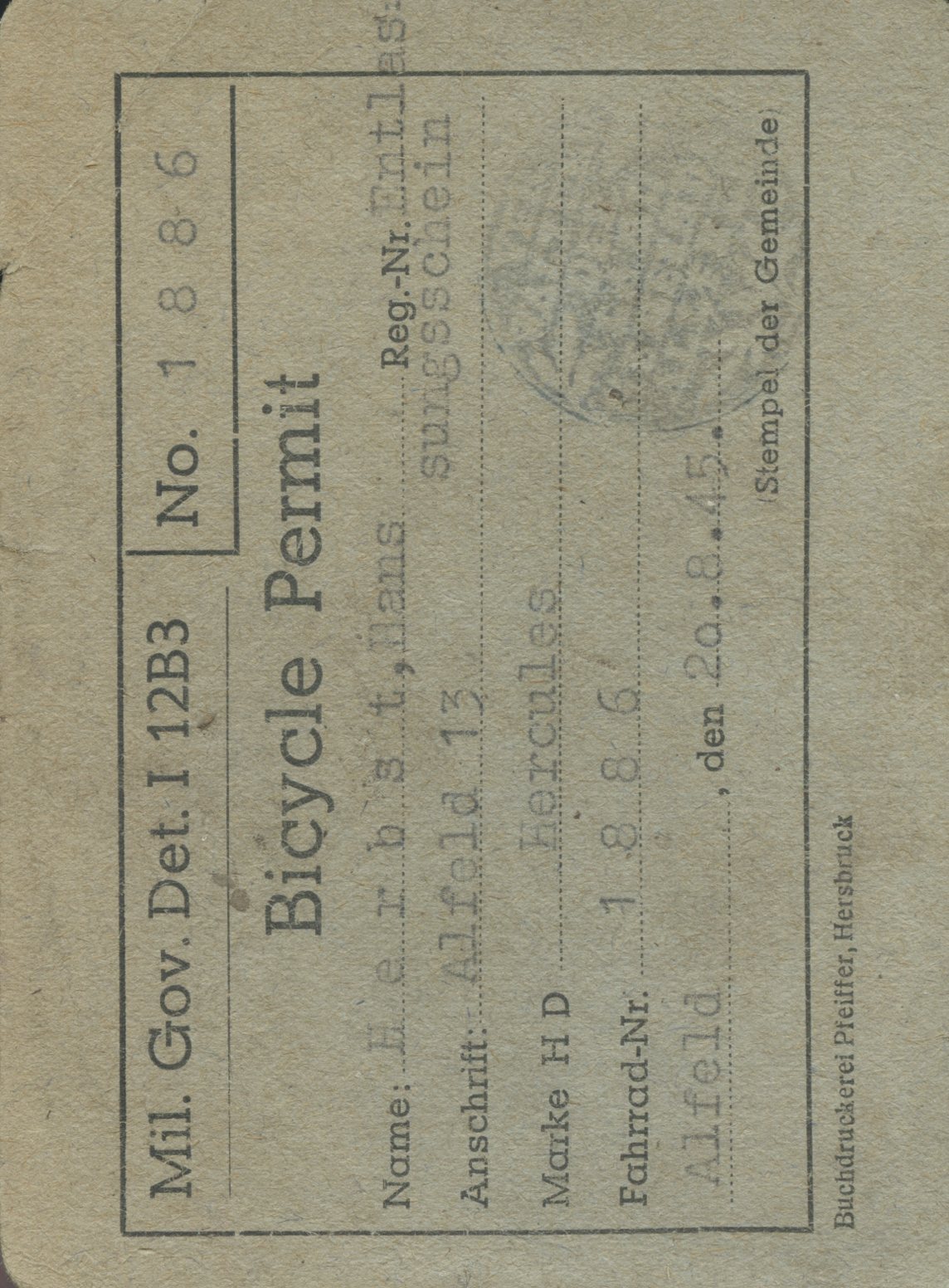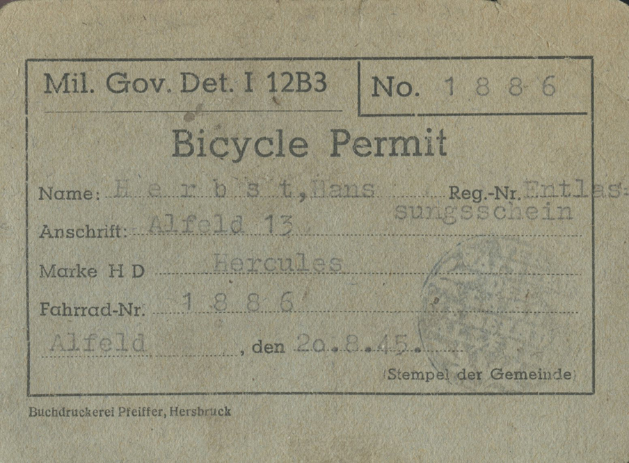 [Below: This is an Allied occupation bicycle permit, issued August 20, 1945, for a Hercules brand bicycle. 'Do you have permission to ride that bicycle?!']
