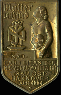 [Above: The 'Cross of Honor of the German Mother', awarded to mothers who had eight or more children. In the Third Reich motherhood was a cherished and noble act. This award came in three classes: bronze (4-5 children), silver (6-7 children) and gold (8 or more). But this award was more than just an empty gesture. The famous newspaper Völkischer Beobachter (People's Observer) in 1938 stated: