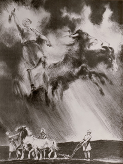 [Above: A tired soldier falls into the warm, healing embrace of a woman. This painting is by Hans Adolf Bühler and is called 'Heimkehr' (Homecoming).]