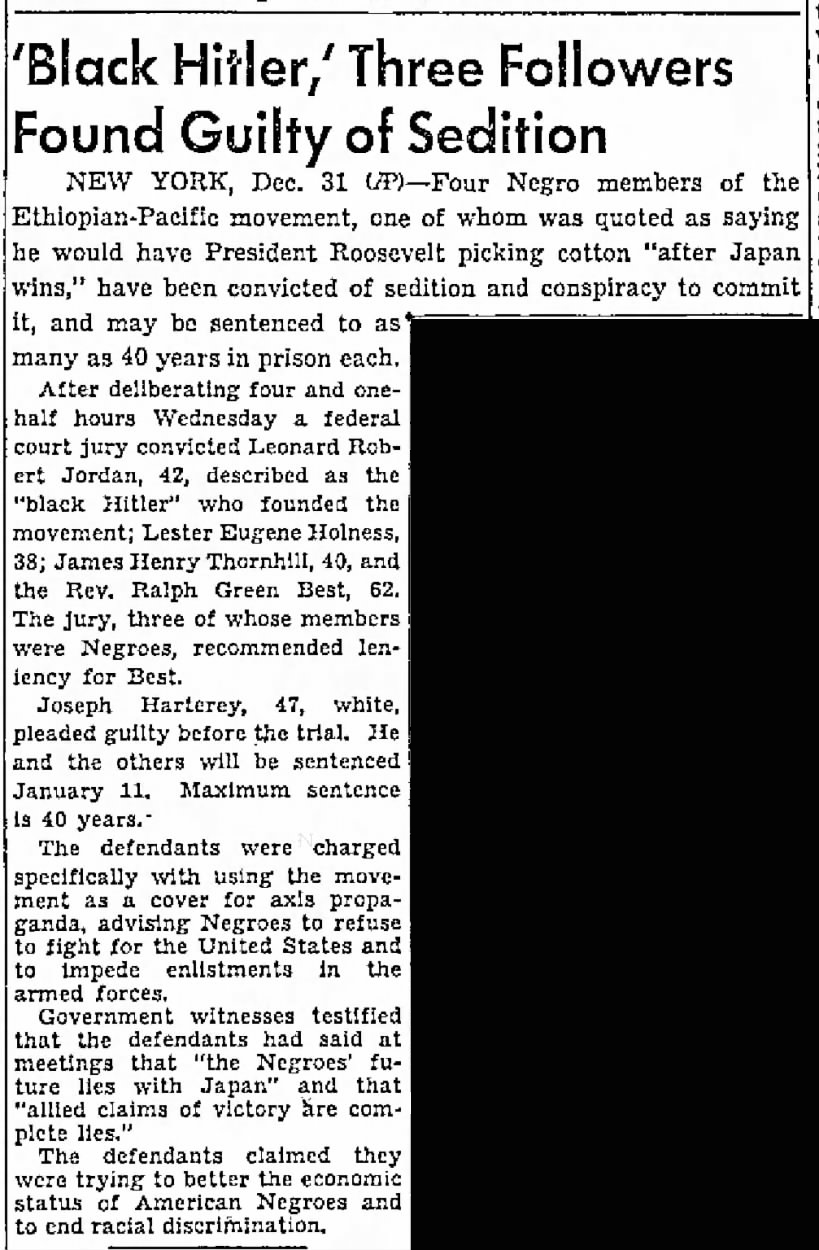 'Along with Elijah Muhammad, Jordan was among the most prominent of the pro-Tokyo spokesmen in the United States; certainly he was the most prominent of this group in Harlem. The FBI reported that while toiling for the aforementioned Japanese shipping company and residing in Japan he "found the Japanese to be very friendly to the Negroes and that he had the privilege of studying the customs of the Japanese and becoming a member of... society in Japan.