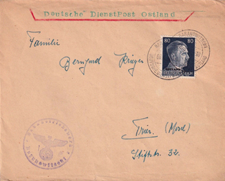 [Above: Postage stamp from the occupation of the eastern territories, 1916-1918. The overprint stands for: 'Postal District of the Supreme Commander of the East'. Click image to see full set.]