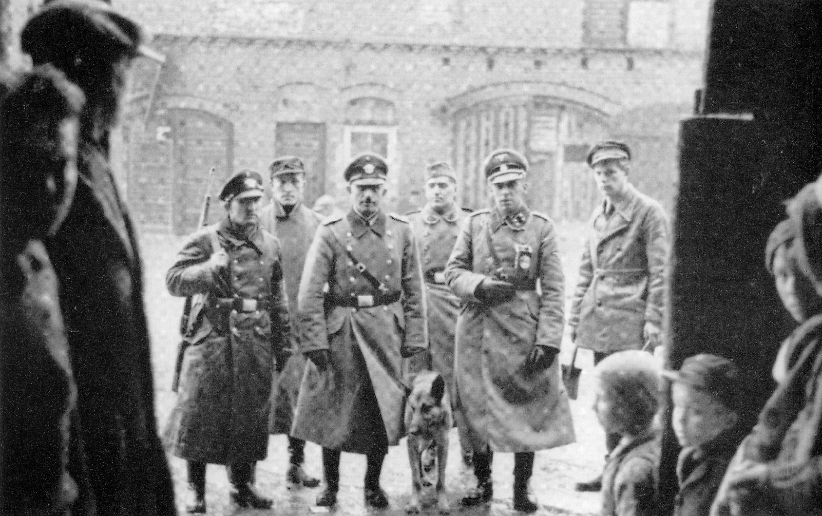 [Above: A group of SS men and police in Bydgoszcz, Poland, before searching a building in the opening months of the war.]