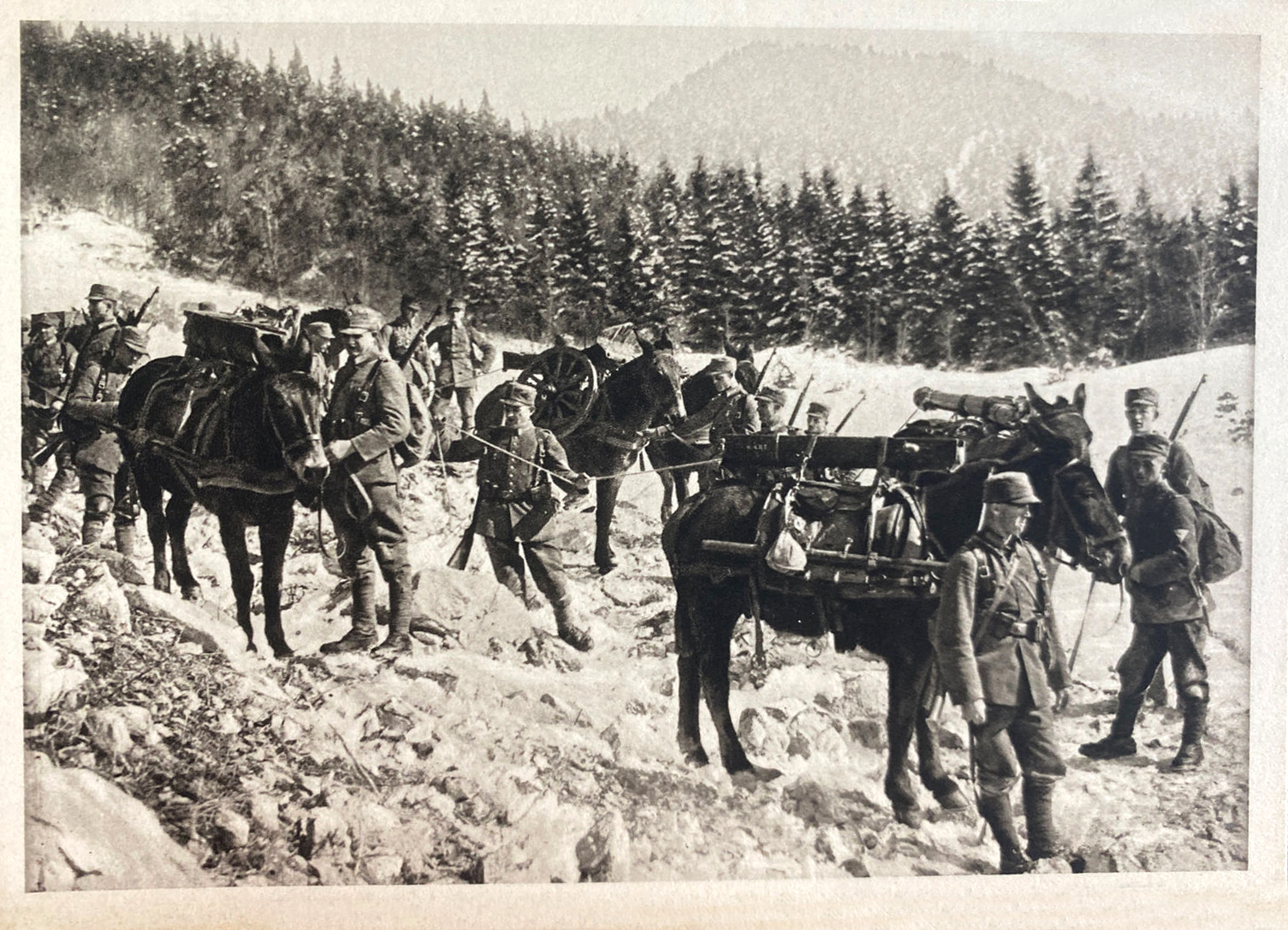 [Above: King Ludwig III visiting his troops while a Red Cross dog looks on.]