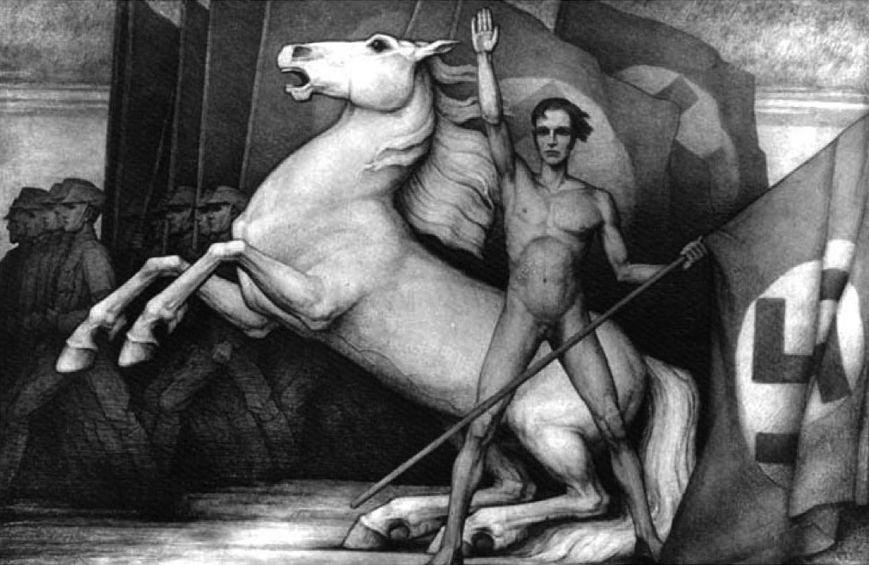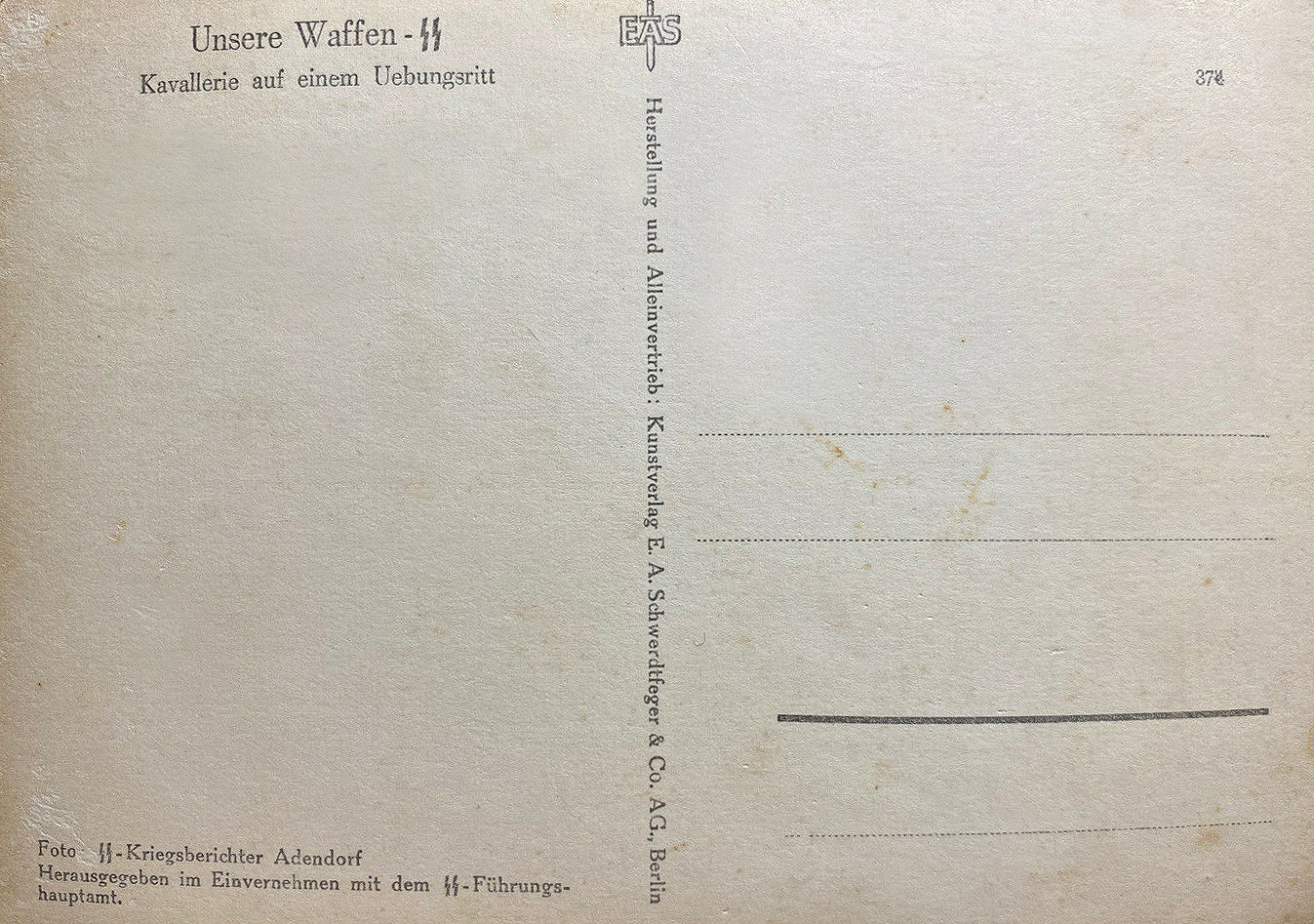 [Above: Front. 'Deutsche Künstler und die SS - An der Schwemme' (German artists and the SS - At the Pond). Artist postcard no. 9412 from Adolf Dahle, published by order of the Reichsführer-SS, SS-Hauptamt, Berlin.]